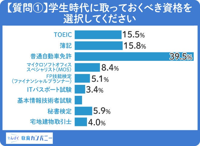 学生時代に取っておくべき資格に関するアンケートでは、39.5%が「普通自動車免許」と回答しています。