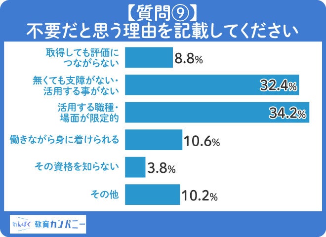 資格を取得しても不要と感じる理由に関するアンケートでは、34.2%が「活用する職種・場面が限定的」と回答しました。