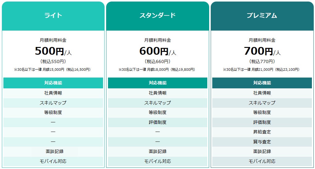 また、できるだけ導入しやすいようリーズナブルな料金設定を3つのプランでご用意しております。ライトプランではお一人500円(税込550円)から、プレミアムプランでもお一人700円(税込770円)となっております。