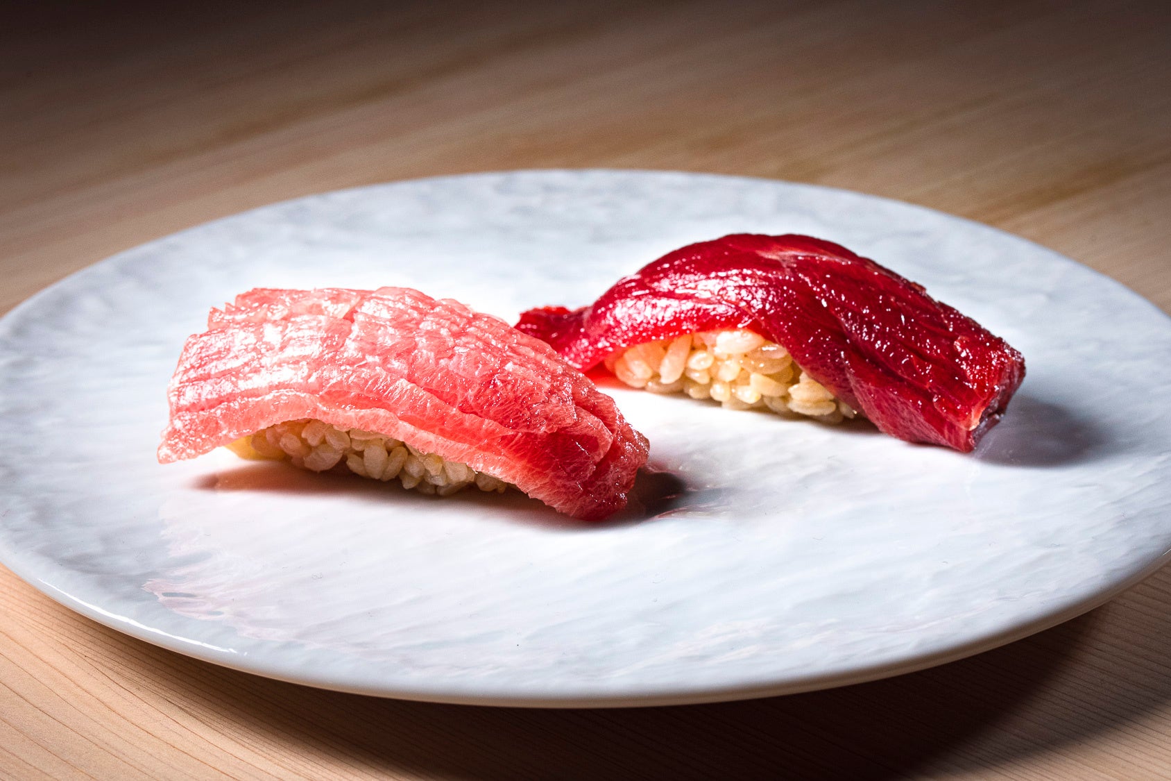 赤酢と白酢の二種を使い、油のある魚やマグロは赤酢のシャリで握り、白身魚やたんぱくな魚には白酢を使用。