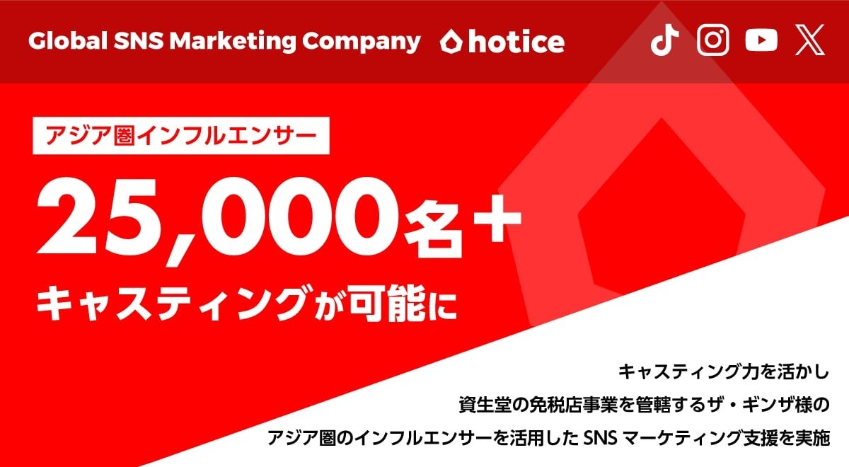 グローバルインフルエンサーマーケティング事業を展開するhotice(ホットアイス)株式会社(本社:東京都渋谷区、代表取締役社長:趙 無極、以下、「hotice」)は、日本、韓国、台湾、香港などのアジア圏におけるインフルエンサー25,000名超のキャスティングが可能になりました。