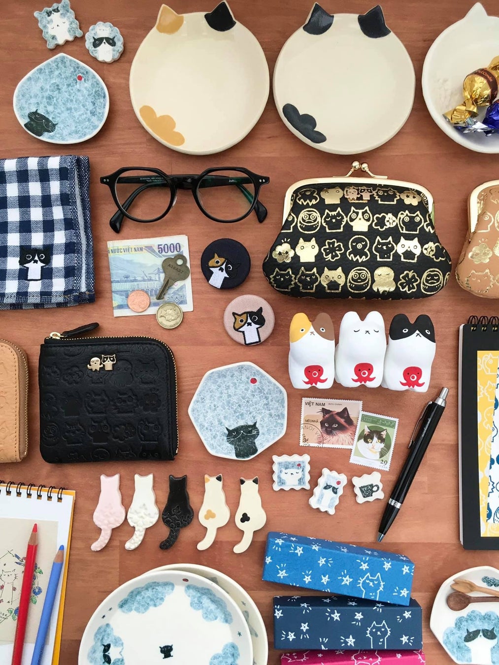 うつわには、猫とてんとう虫(幸せを知らせる神の使者)、フクロウ(不苦労)。お財布には、タコやだるま(七転び八起)、幸せのクローバー。猫とタコ、猫とてんとう虫の張り子人形。