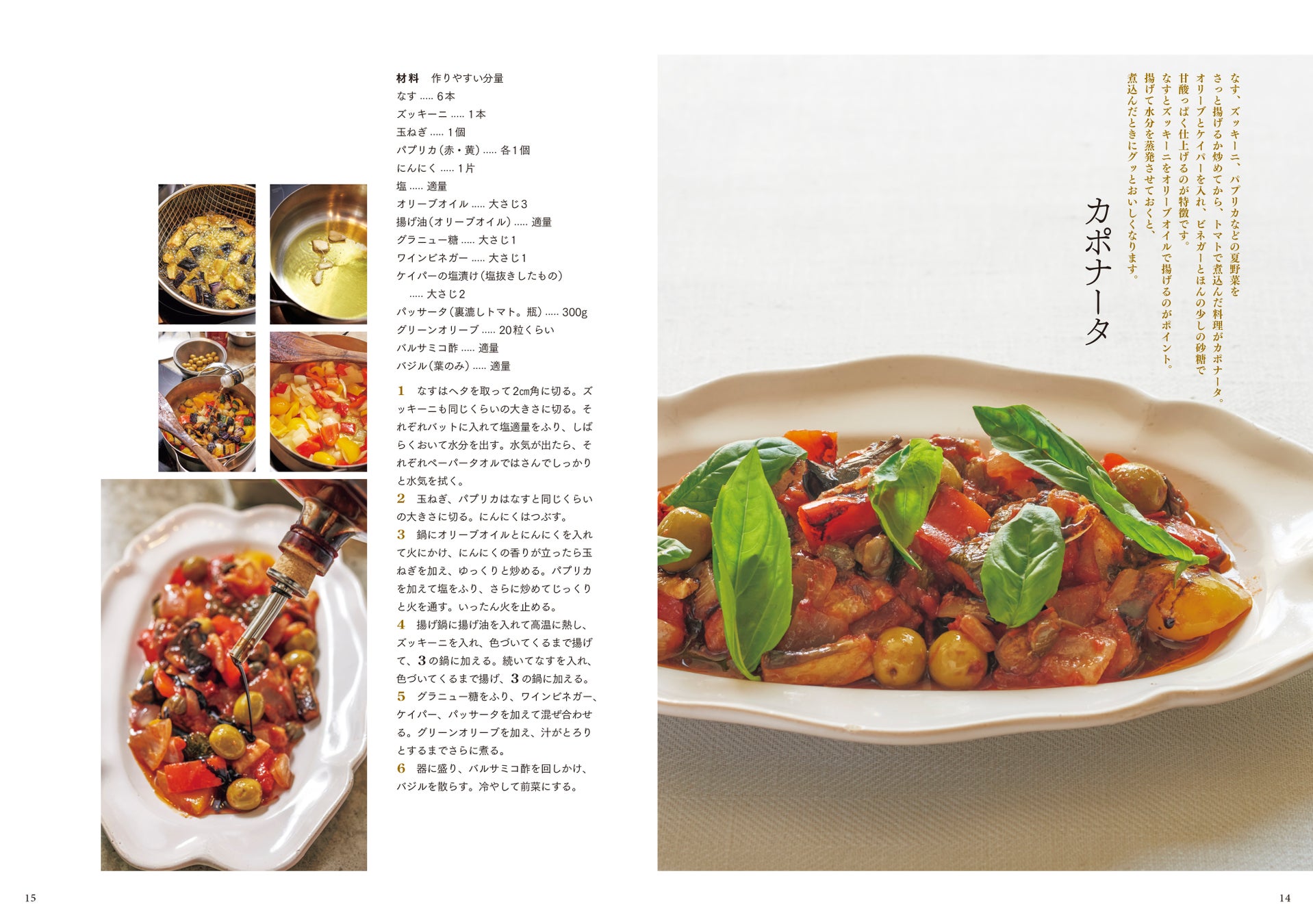また、ほんの少しの酢を加えることでグッと味が引き立つのが、本書で紹介する煮ものです。酢のもつ発酵のうまみが食材やほかの調味料の力を引き出し、奥深さと味わい深さを増します。ほんの少しあるかないかで別ものになる、これが酢の底力です。強い酸味があるわけではないけれど深いおいしさが醸し出されます。たとえばいわしであれば身離れも大変よくなり、生臭さのない味わい深い煮ものができます。酢を加えて肉を煮たりマリネすれば、やわらかく風味豊かに仕上がります。カポナータもそのよい例です。酸っぱく仕立てるのではなく、いろいろな夏野菜のうまみを一つにまとめておいしさを引き出す役目を担っているのが少量の酢です。