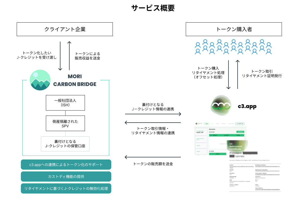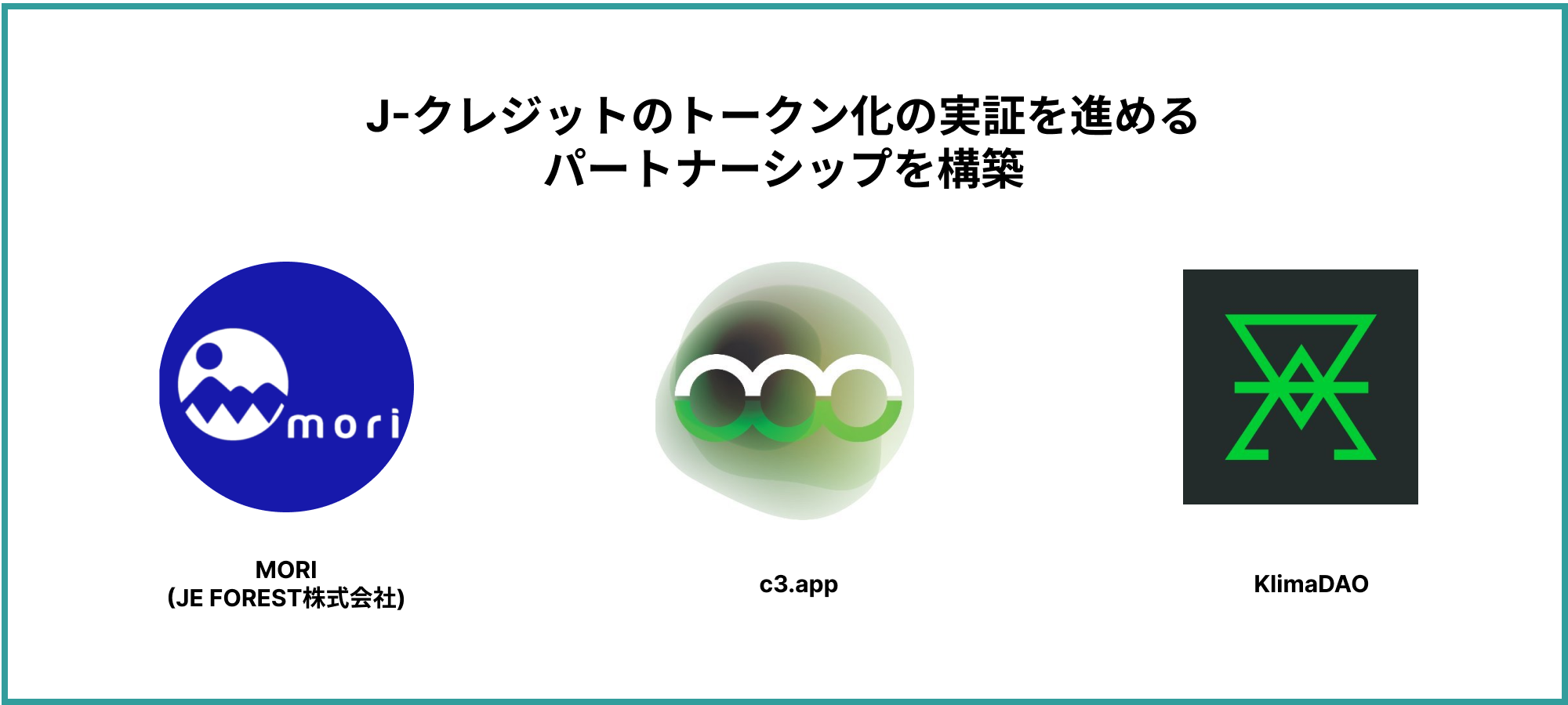 JE FORESTが運営する「MORI」は、カーボンクレジットのオンチェーン化に関する豊富な実績を有するC3及びKlimaDAOと提携し、J-クレジットのトークン化の実証及びトークン化サービスを開始