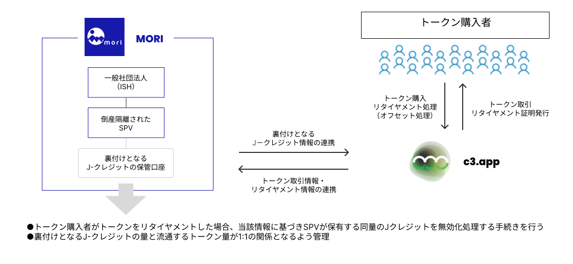 以下の手続きで、C3との協業の下、MORIがJ-クレジットのカストディの役割を果たしながら、Jクレジットを裏付けとしたトークンの発行及び流通、並びに裏付けとなるJ-クレジットの管理を進めてまいります。