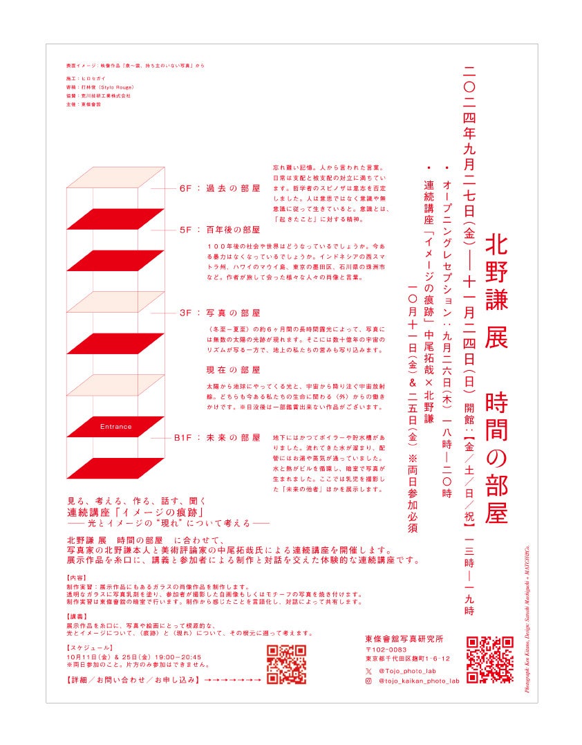 北野謙は、人間の視覚を超えたヴィジョンを写真で表現し続けてきた写真家として広く知られています。本展示「時間の部屋」は、東條會舘が100年以上にわたりお客様と共に紡いできた時間を背景に、ギャラリー東條會舘写真研究所を舞台に開催いたします。建物の各フロアに4つの新作を含め、インスタレーションした様々な「時間の部屋」を、時に鑑賞者自身でイメージを出現させながら巡ることで、過去、現在、未来といった様々な次元が交差し、時空を超えた物語を体験できます。