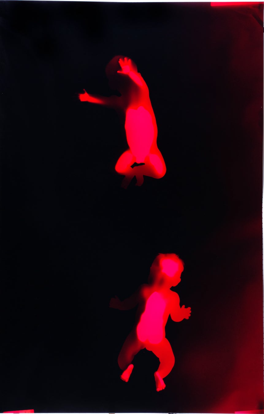 B1F 未来の部屋 | 地下にはかつてボイラーや貯水槽があ りました。流れてきた水が溜まり、配 管にはお湯や蒸気が通っていました。 水と熱がビルを循環し、暗室で写真が生まれました。ここでは乳児を撮影した「未来の他者」ほかを展示します。