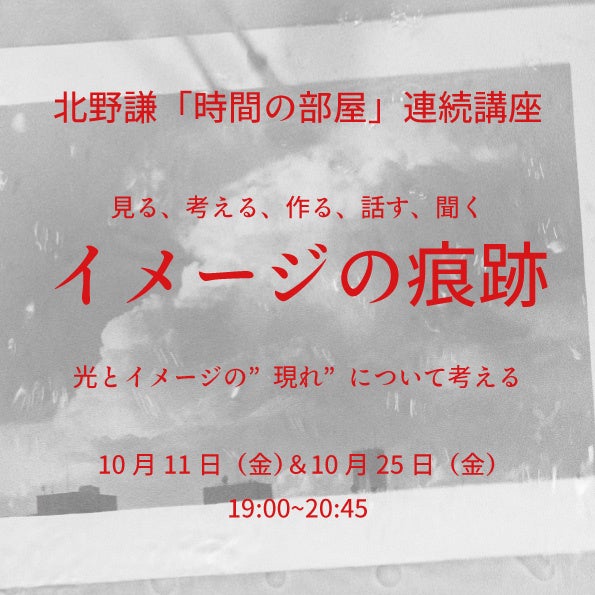 北野謙写真展「時間の部屋」に合わせて、写真家の北野謙本人と美術評論家の中尾拓哉氏とによる連続講座を開催します。展示作品を糸口に、講義と参加者による制作と対話を交えた体験的なレクチャーです。