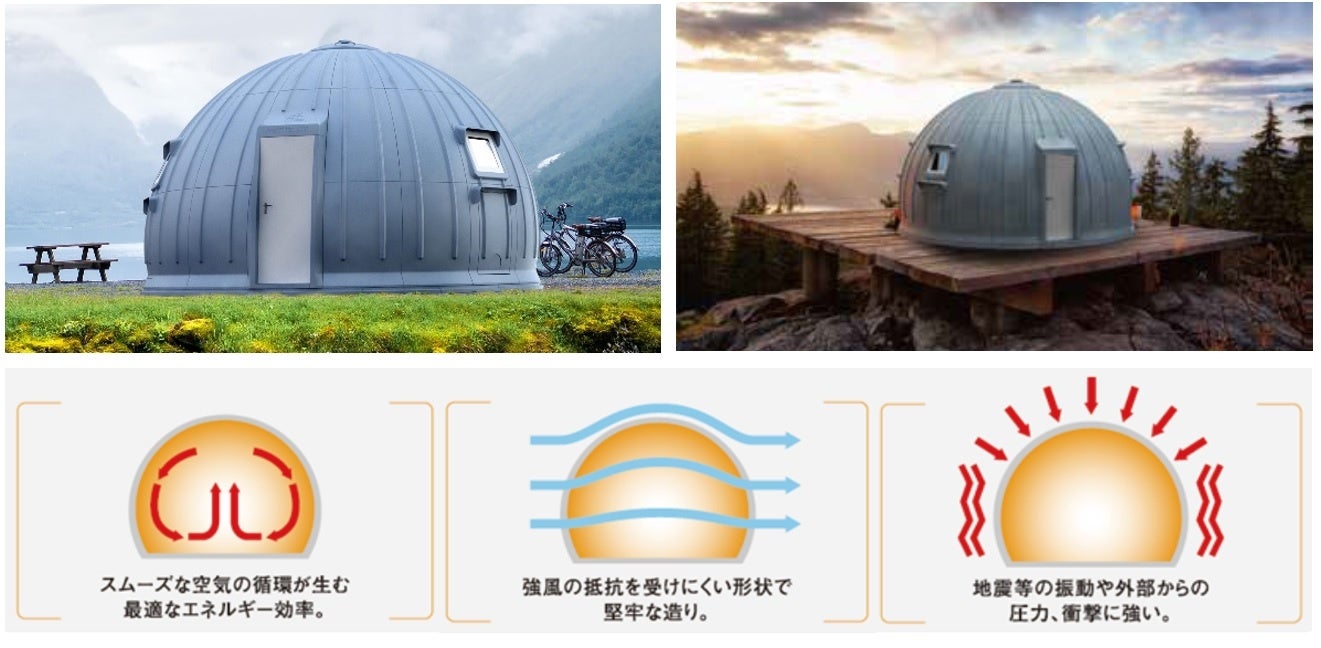 ることができるドームハウスです。二重構造の壁面パネルは耐衝撃性をはじめ、外部衝撃に強く、