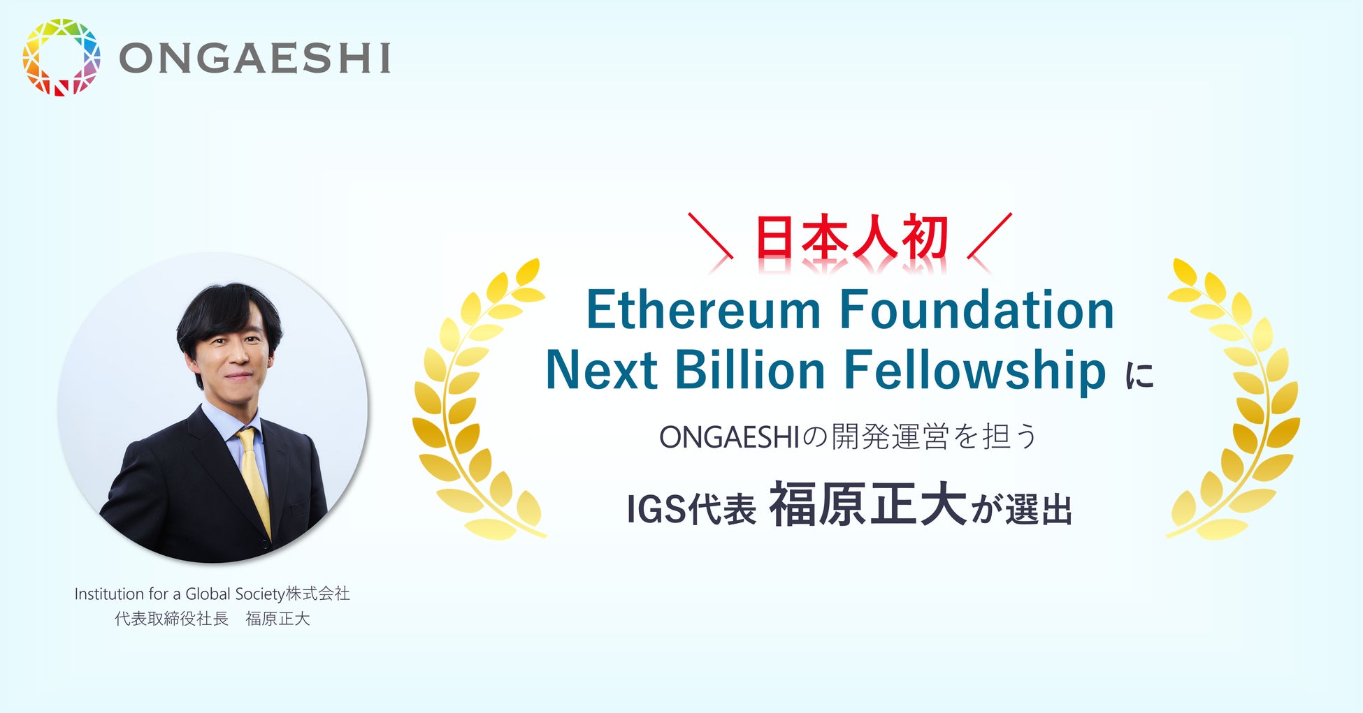 ONGAESHIプロジェクトチームは、ONGAESHI(オンガエシ)の開発・運営を担う、Institution for a Global Society 株式会社(以下、IGS)代表取締役社長 福原正大が、「Ethereum Foundation Next Billion Fellowship」(以下、本フェローシップ)に日本人初の事例として選出されたことをお知らせします。社会課題を解決する、新しいWeb3のユースケースになると評価されたためです。国内外の教育格差の課題に挑戦するONGAESHIを推進するため、ネットワーク、開発、PRなどの様々な支援を、Ethereum Foundationから受けることになります。