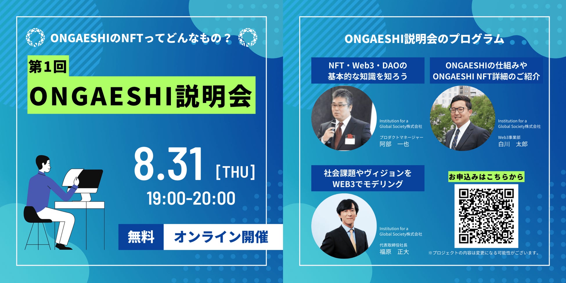 この選出を記念して、福原が「Web3 を使った社会課題解決方法」をテーマに、ONGAESHIのオンラインイベント(8月31日19時~開催)に登壇いたします。
