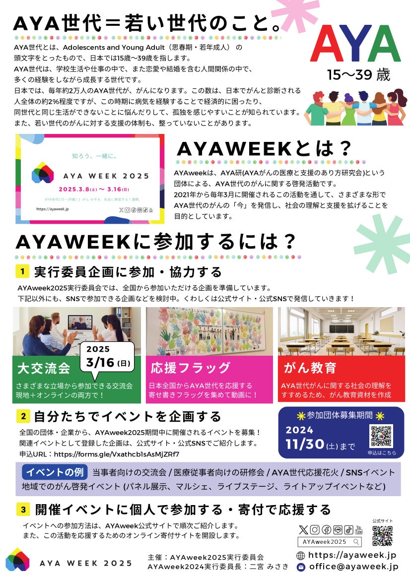 2025年3月8日から3月16日のAYA week 2025期間中には、全国でたくさんのイベントが開催されます。詳しくは、ホームページや公式YouTubeをご覧ください。