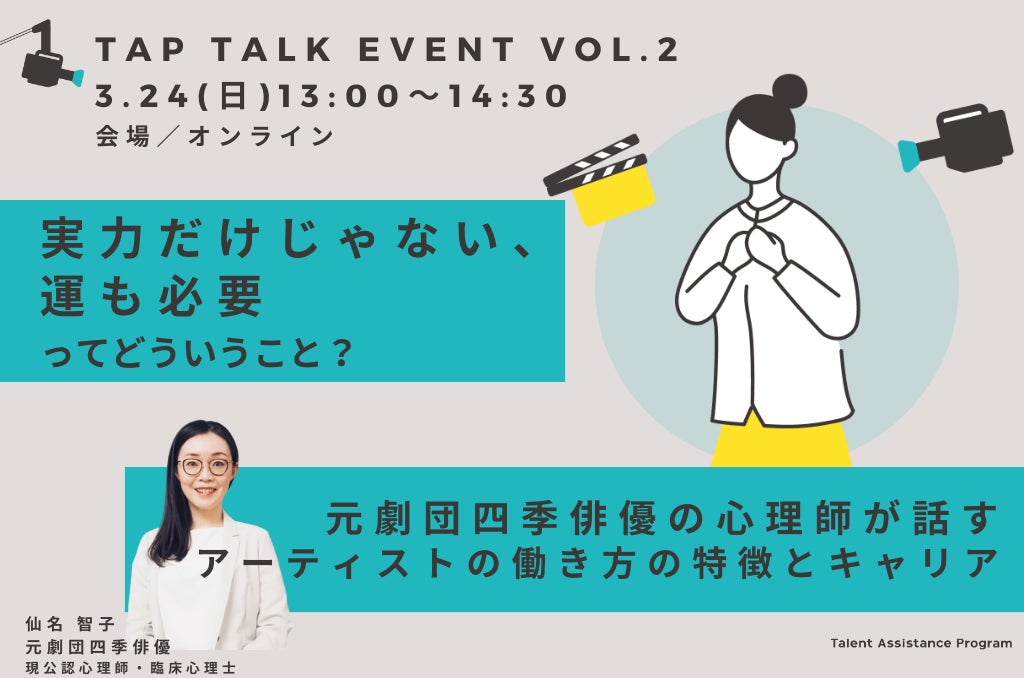 芸能に特化したメンタルサポートサービス「TAP(ティーエーピー)」は、元劇団四季俳優・現公認心理師/臨床心理士でTAPサポーターの仙名智子をメインスピーカーに、トークイベントを開催いたします。