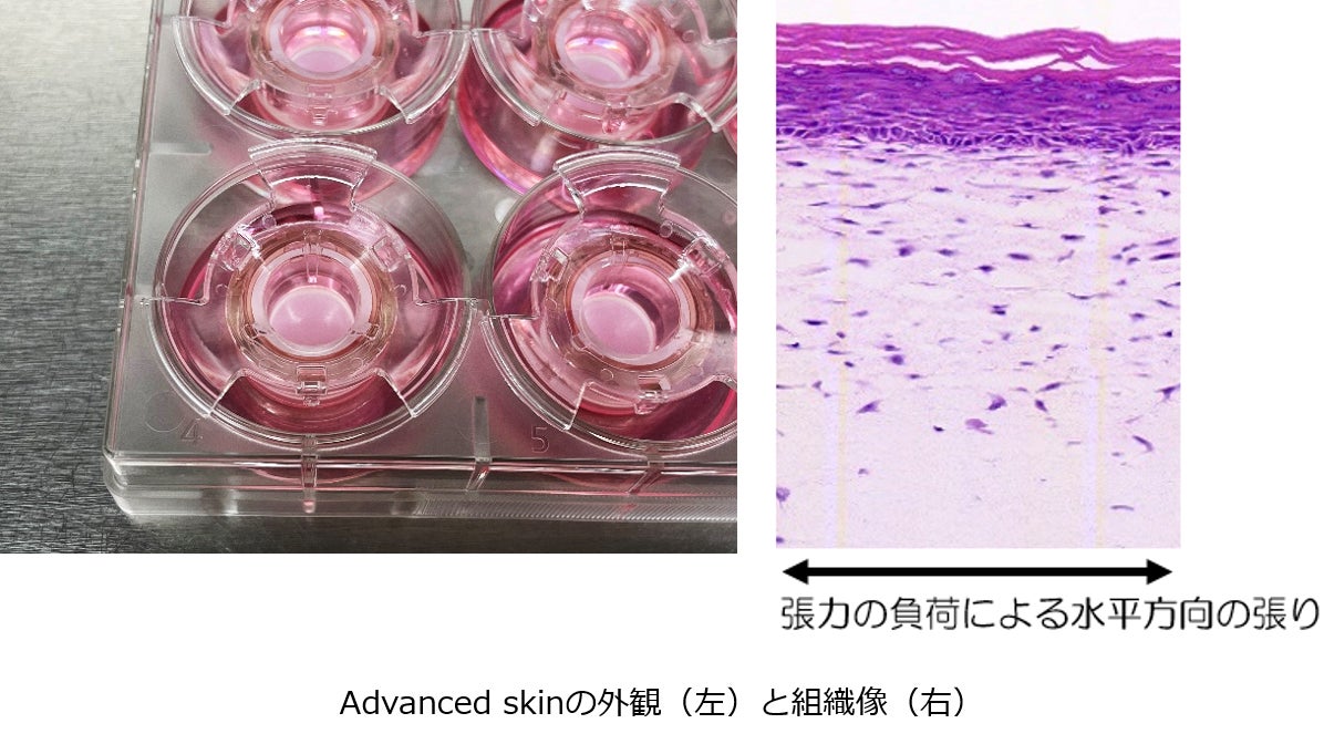 皮膚は人体最大の器官系であり、生体外から受ける外的刺激などの物理的刺激に応答して生体を保護する役割や体温調節など、生存に不可欠な役割を果たしています。皮膚は、「肌のハリ」として知られているように、皮膚内部において細胞や細胞外マトリクスによって皮膚表面に平行な方向に引っ張り合う張力均衡が重要な役割を果たしています。現在のヘルスケア業界では、動物実験代替法として皮膚の細胞を生体外で培養した人工皮膚により、主として化粧品などの安全性評価が進められていますが、充分な化粧品素材の機能評価や皮膚微小刺激などの評価を、より効率よくする人工皮膚の開発が長らく期待されてきました。当社は、理化学研究所などとの共同研究により、人工皮膚に天然皮膚のような張力均衡を再現することにより、医薬品や化粧品などの機能性評価や炎症モデル、皮膚微小刺激モデルなど高感度に評価できる「Advanced Skin」を開発しました。
