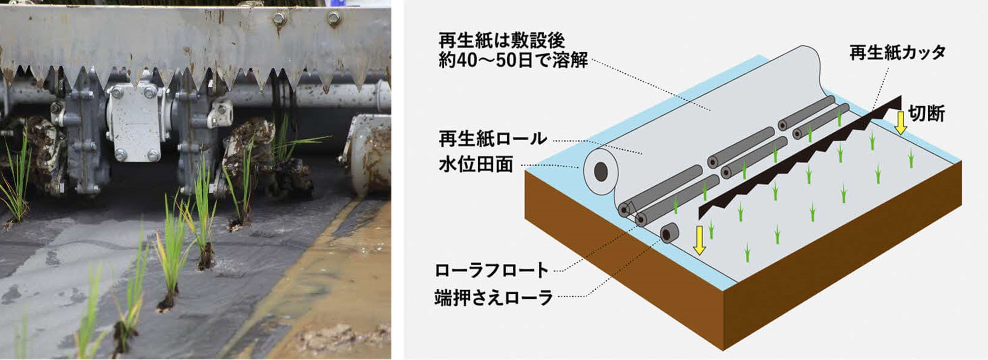 田植えをしながら田面に専用の紙を敷き、雑草の発生・伸長を抑える事が出来る田植機。雑草にあたる日光を遮ることで、雑草の発生・伸長を抑え、除草剤と同程度の抑草効果を発揮します。紙は40-50日で溶解して有機肥料となるため、薬剤を使用せずに効率的な除草効果が得られます。有機栽培でネックになる除草作業の労力を軽減できるのに加えて、安定した収量が見込めるため経営の安定化にもつながる製品です。農林水産省の「みどりの食料システム戦略」において国の認定を受けており、全国で導入する農家が増えています。