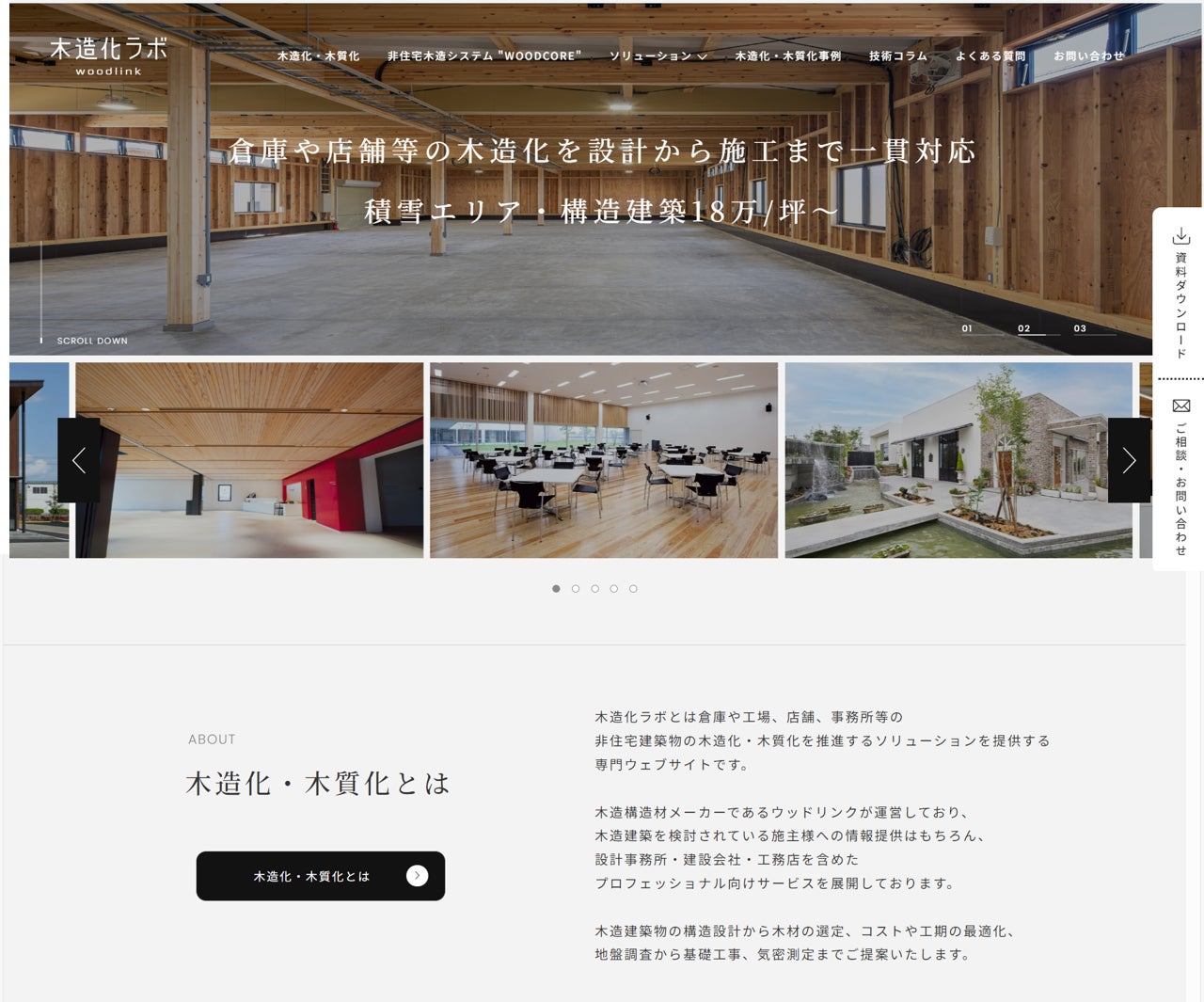 「木造化ラボ」(https://mokuzo-labo.com)は、非住宅木造建築に関するあらゆる情報を集約・掲載するための専門サイトです。「WOODCORE」の詳細をはじめ、木造化・木質化のメリット、事例紹介、よくある質問など、豊富なコンテンツを用意しています。