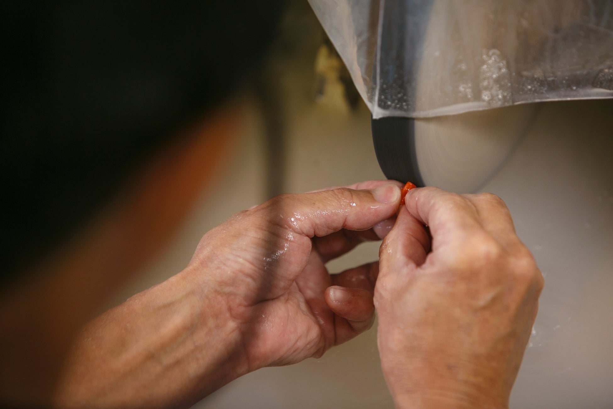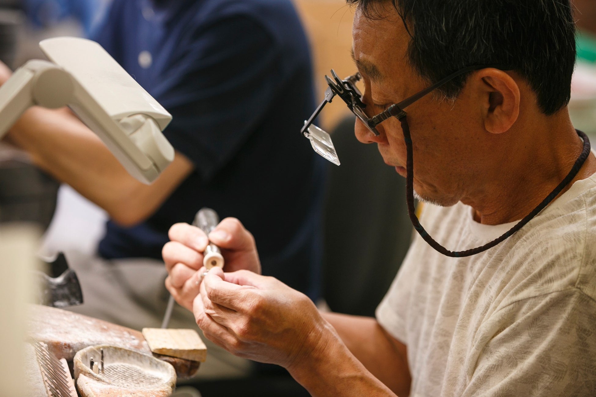 山本氏が最も得意とする彫刻「桜彫り」。若手職人に渡される珊瑚の原木はキズや穴が多いため、桜彫りを施すことで欠点のある珊瑚に新たな命を吹き込みます。