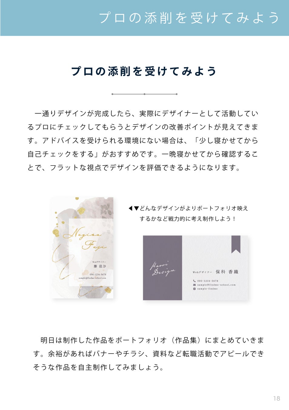 2日目は昨日作成した名刺と持ち帰りで作成したデザインをポートフォリオにまとめていきました。