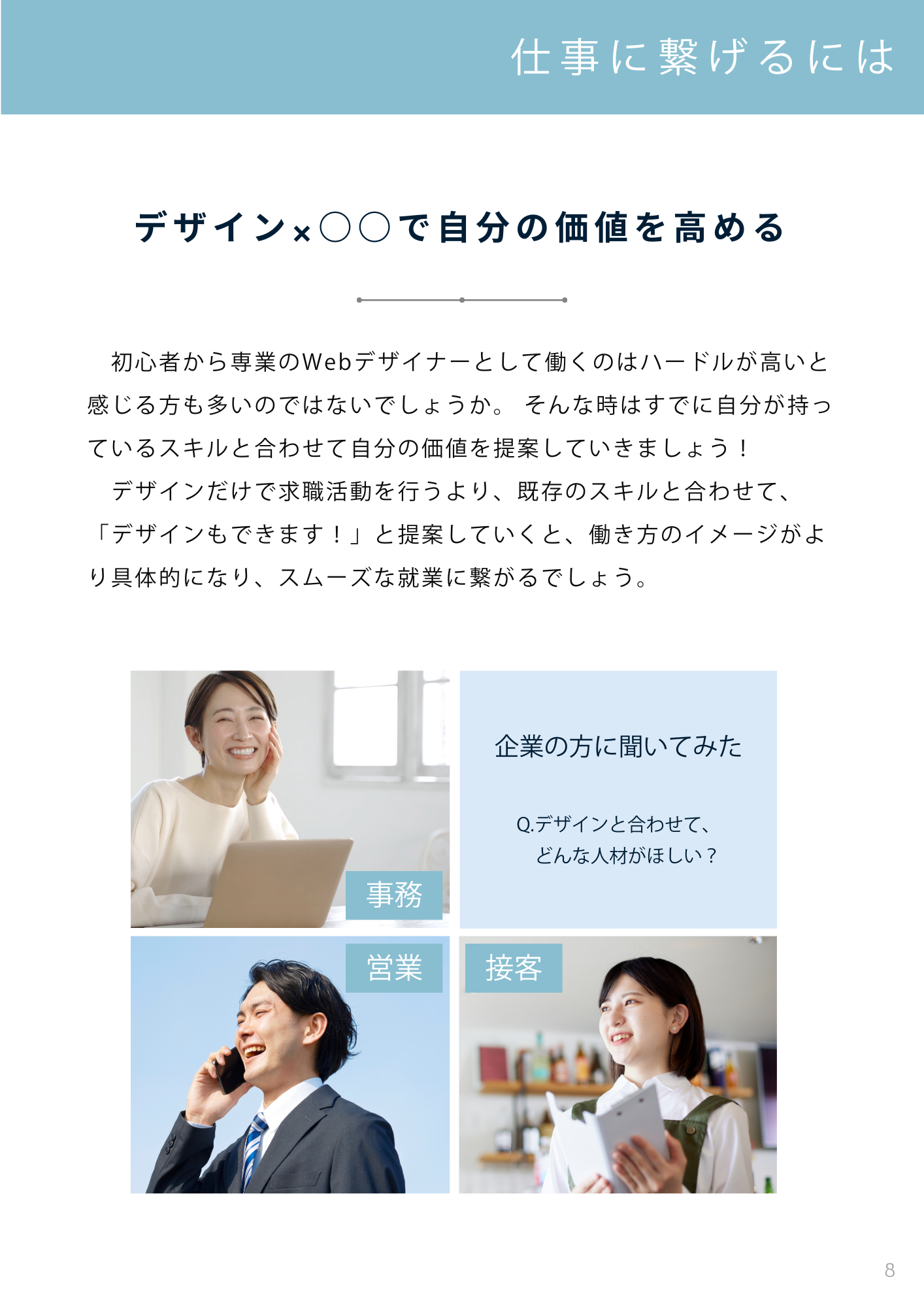 また求職活動では、新しく手に入れた「デザイン」とうスキルだけで戦わず、自身の経歴を振り返り「スキルの棚卸し」を行いましょう。自分がどんな人材か伝え、就職後の働き方を具体的にイメージしてもらうことが大切です。