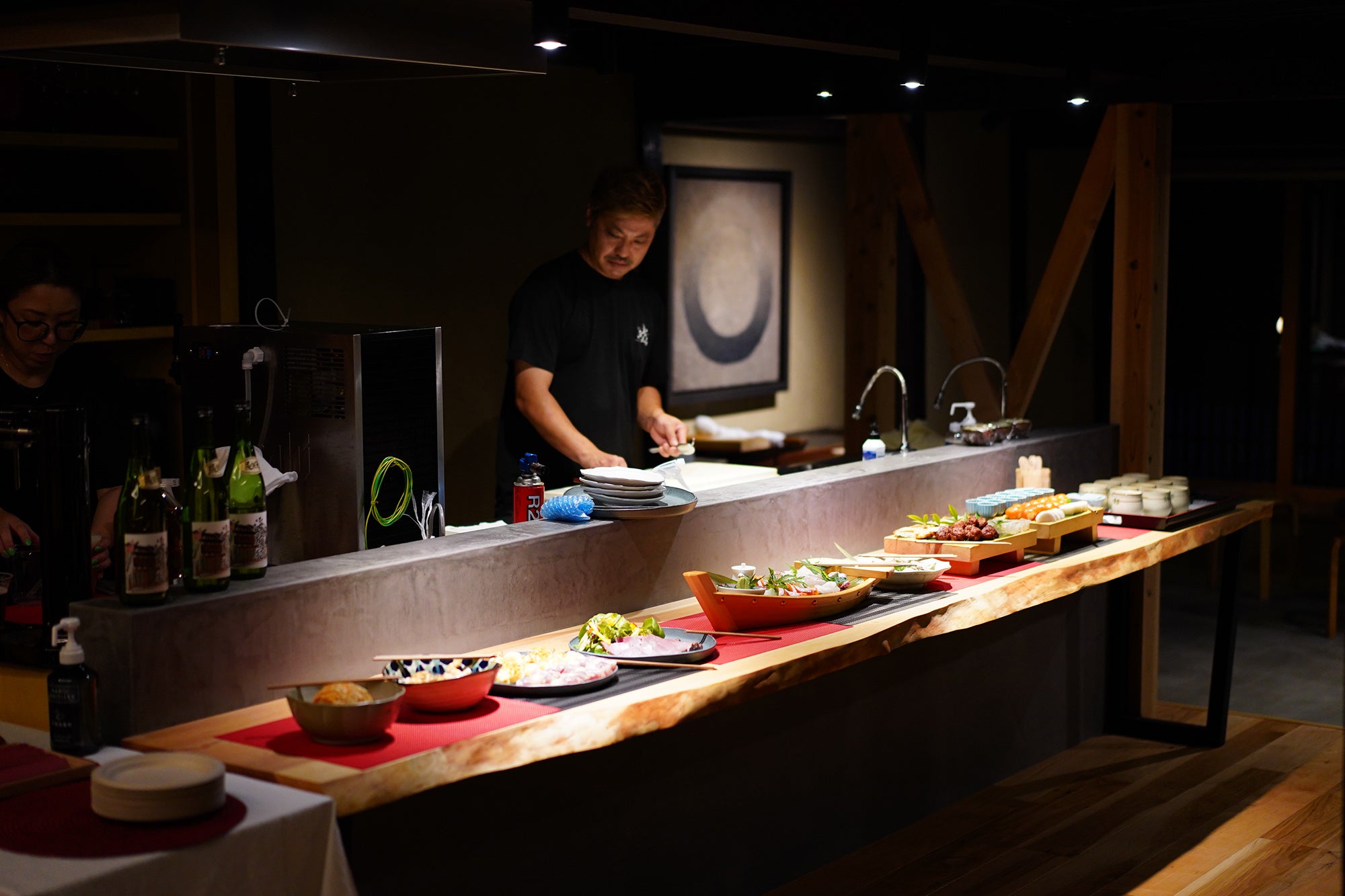 OMOYAの中央にはカウンターキッチンがあり、そこではケータリングやデリサービスをご利用いただけます。地元産の旬の食材を使ったお料理、ワインセラーに並べられた東御市産のワインをお楽しみください(別料金)。ワインを傾け、気持ちをほどく素敵な時間をお過ごしください。