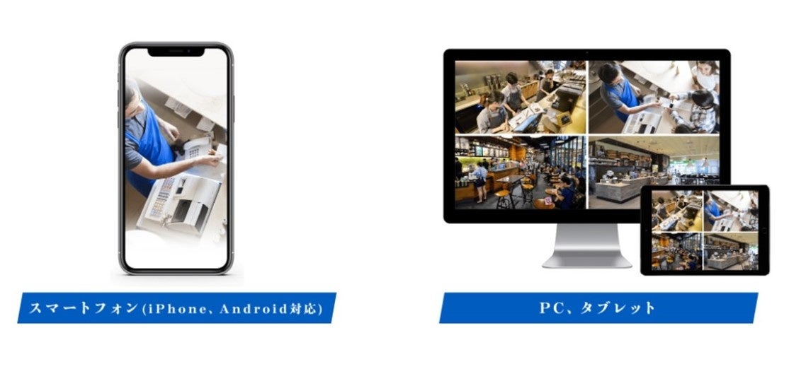 「太陽光カメラ」は、PCやタブレットはもちろん、スマートフォンでもライブ映像を見ることができるため、場所を問わず遠隔監視をすることができます。