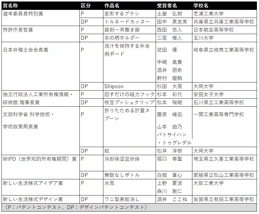 パテントコンテスト/デザインパテントコンテストは、全国の高校生、高等専門学校生や大学生等が創造した