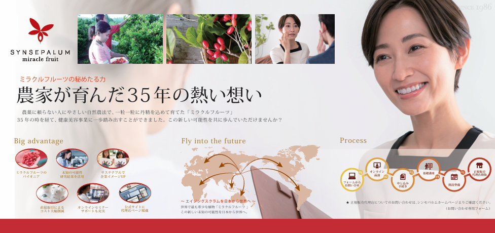 35年の時を経て開発された世界で最も希少なミラクルフルーツ美容健康サプリメント!当社だけが創り出せた唯一無二のブランド「シンセパルム」が意識の高い貴女へ感動をお届けします