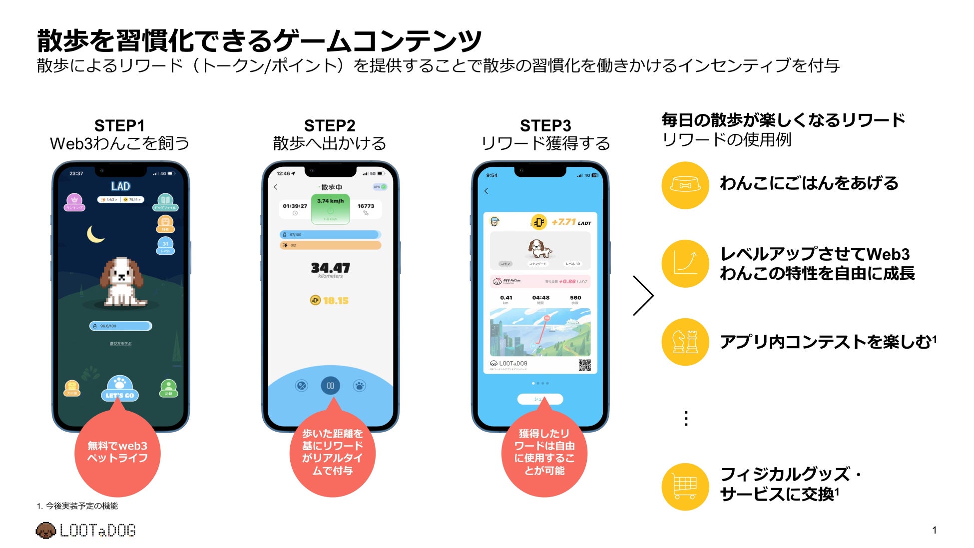 LehmanSoftが開発するLOOTaDOGは、日常の散歩をゲーム化し、Web3わんこ育成を楽しめるアプリです。アプリからワンストップでペットライフを豊かにすることを目標としています。