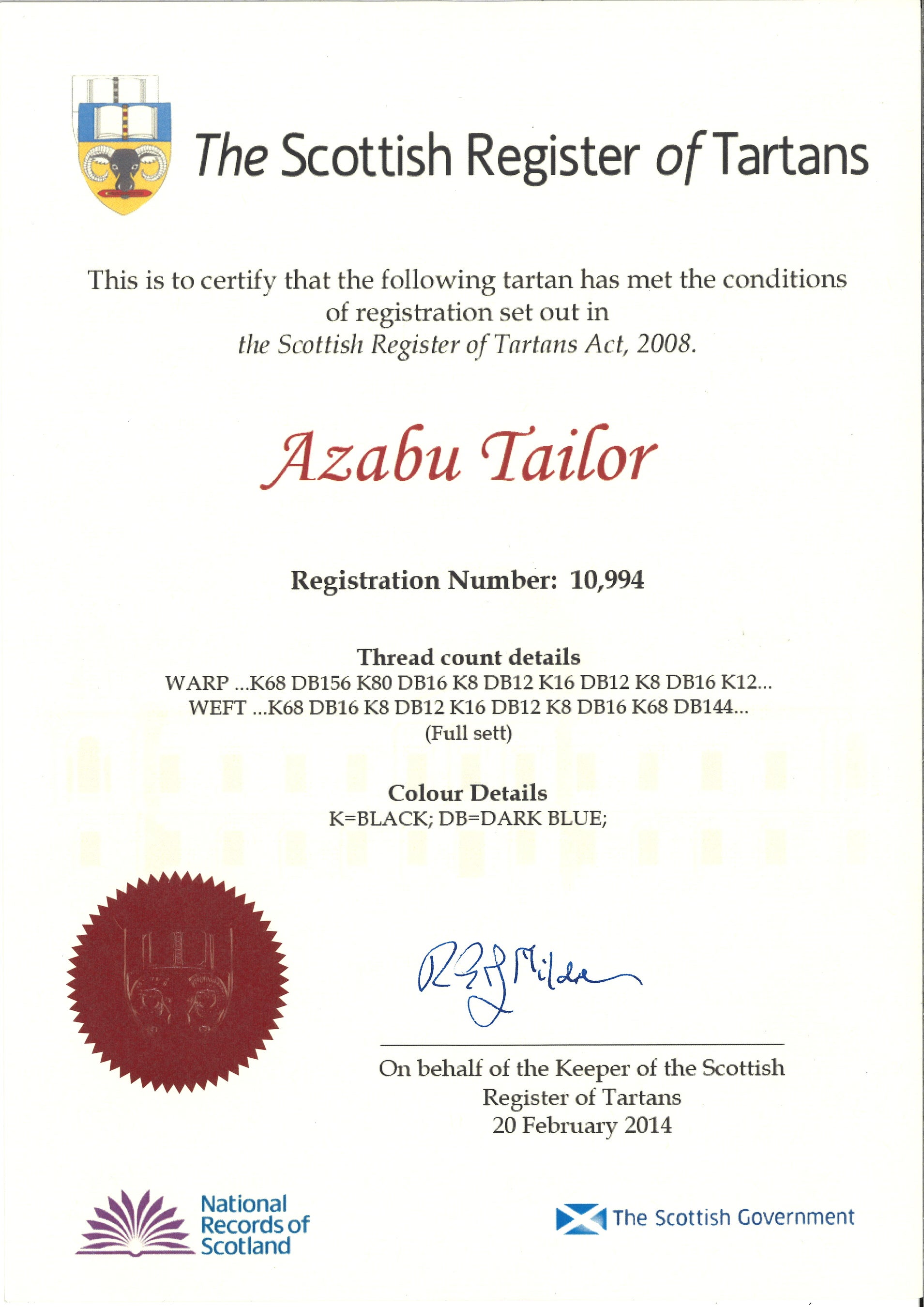 ※麻布テーラーのオリジナルタータンチェック柄は、スコットランド政府が運営するタータンチェック協会において、正式に「The Scottish Register of Tartans」として認定されています。
