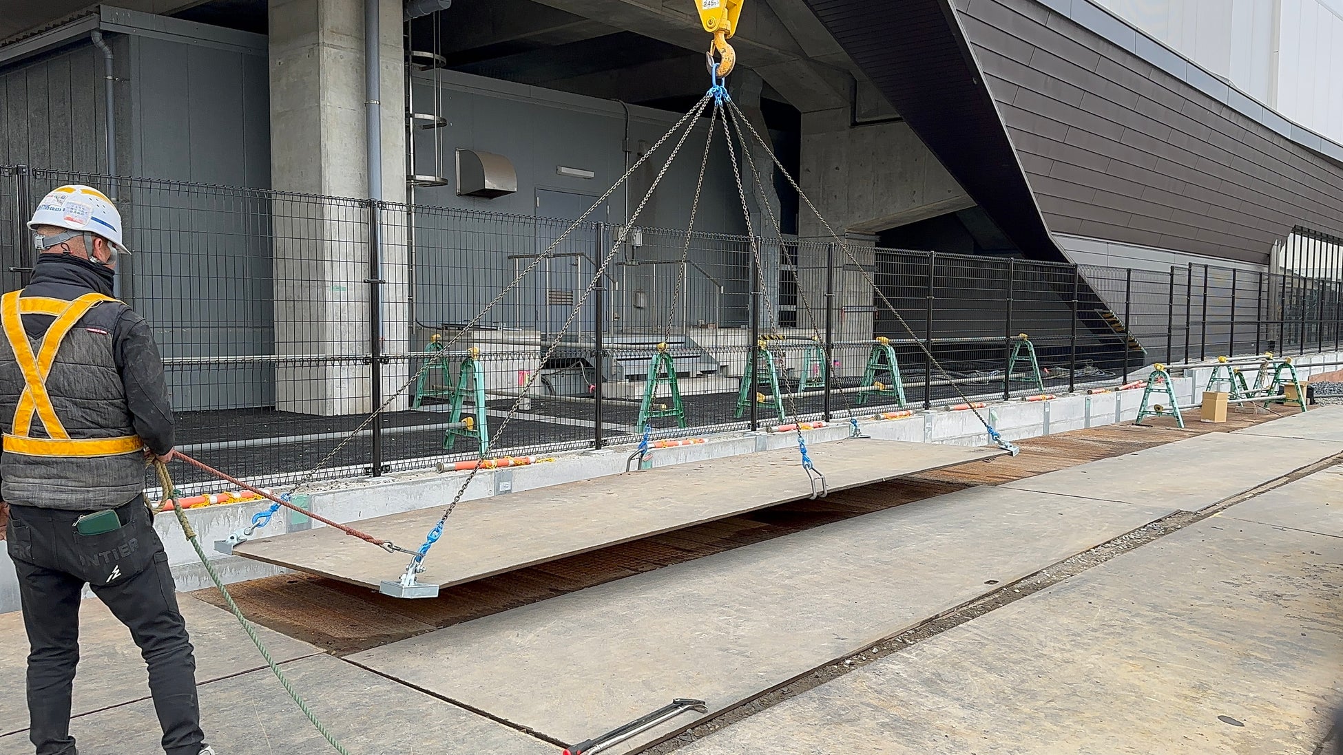 敷鉄板を水平にして、90度のコーナー4点にはめ込み、チェーンやワイヤーで吊した荷重でストッパーロックがかかるクランプを開発したことにより、接地面に対して鉄板は水平安定し、風の影響も受けにくく設置の際も介錯ロープを使用することで労働者の鉄板への介錯が必要なくなり、はめ込み時には泥などが落ちやすいように下部に排出口を備えた。