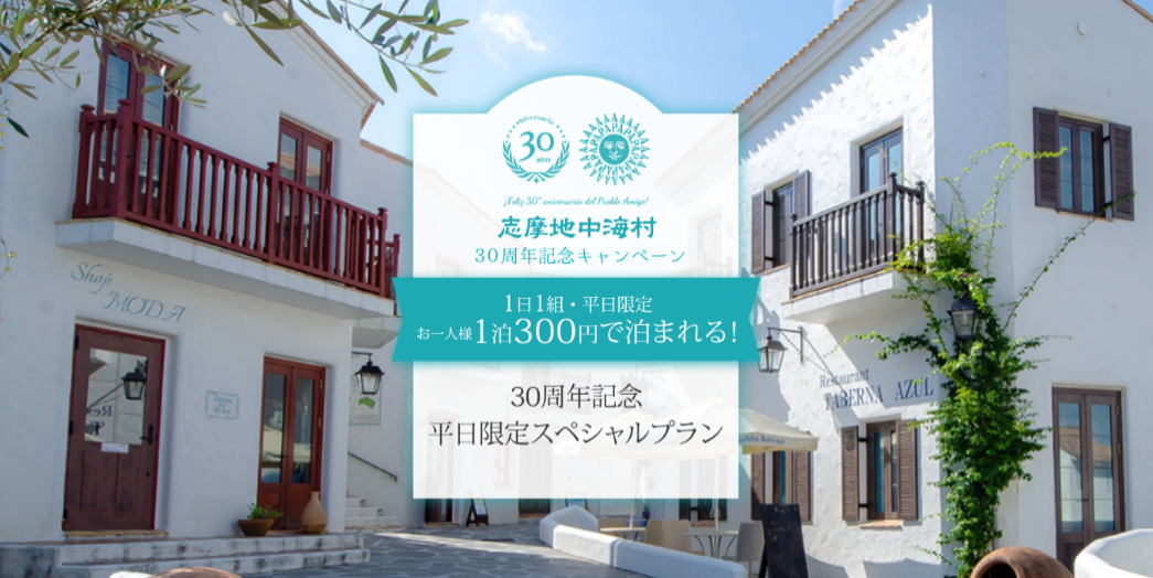 【志摩地中海村】30年間の感謝の気持ちをこめて!1名様一泊二食付300円(税込)の超特別宿泊プラン登場「開業30周年記念イベント」第一弾 発表!