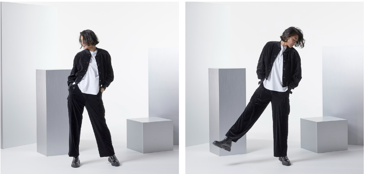 ベロアは、ポルカドット(水玉)のフロッキー加工を施したラグジュアリーな生地で、クラス感のあるカジュアルを演出します。