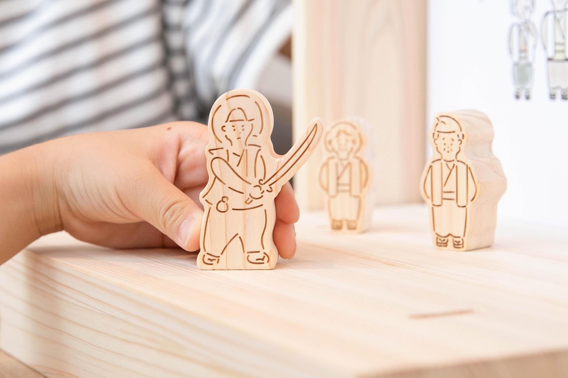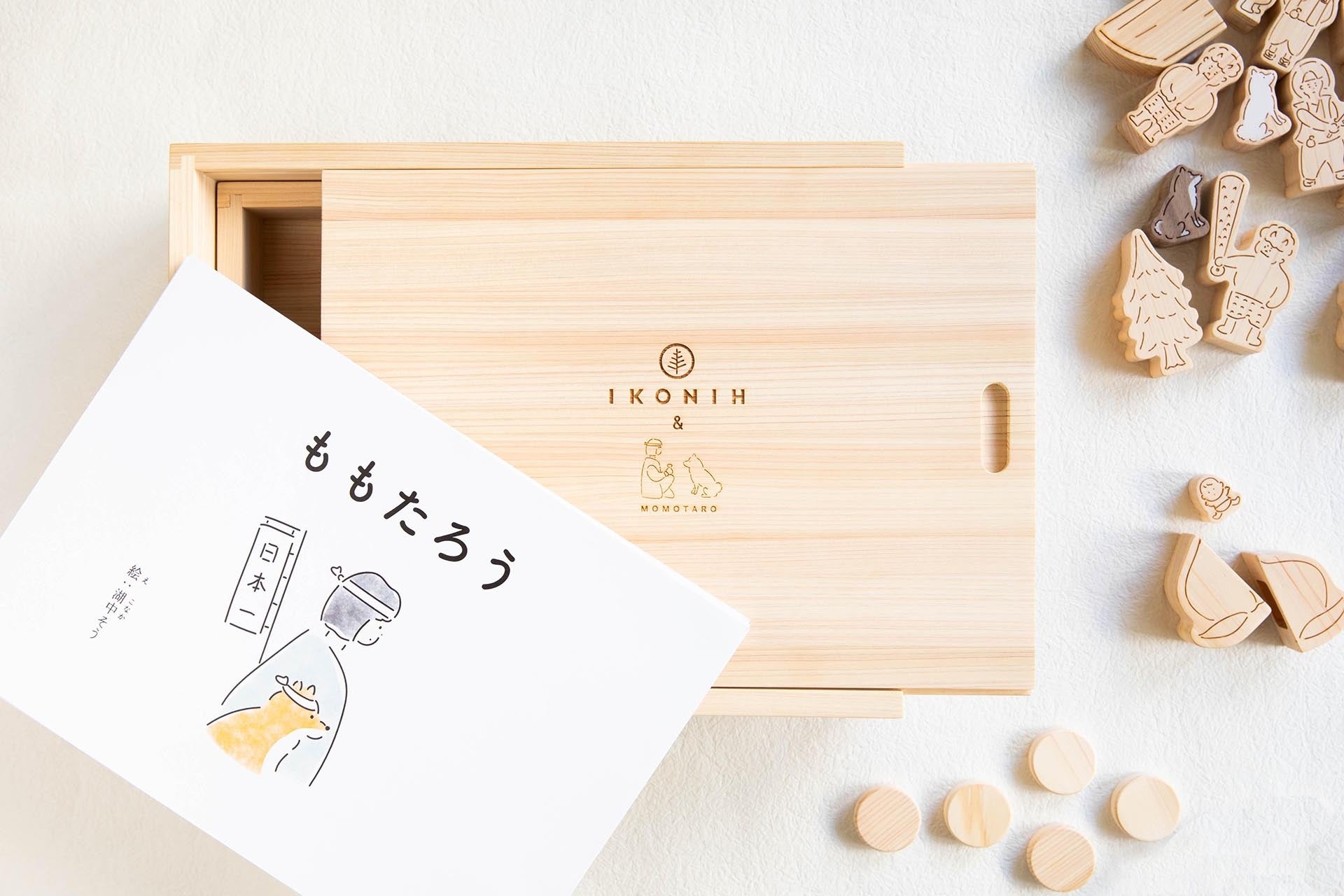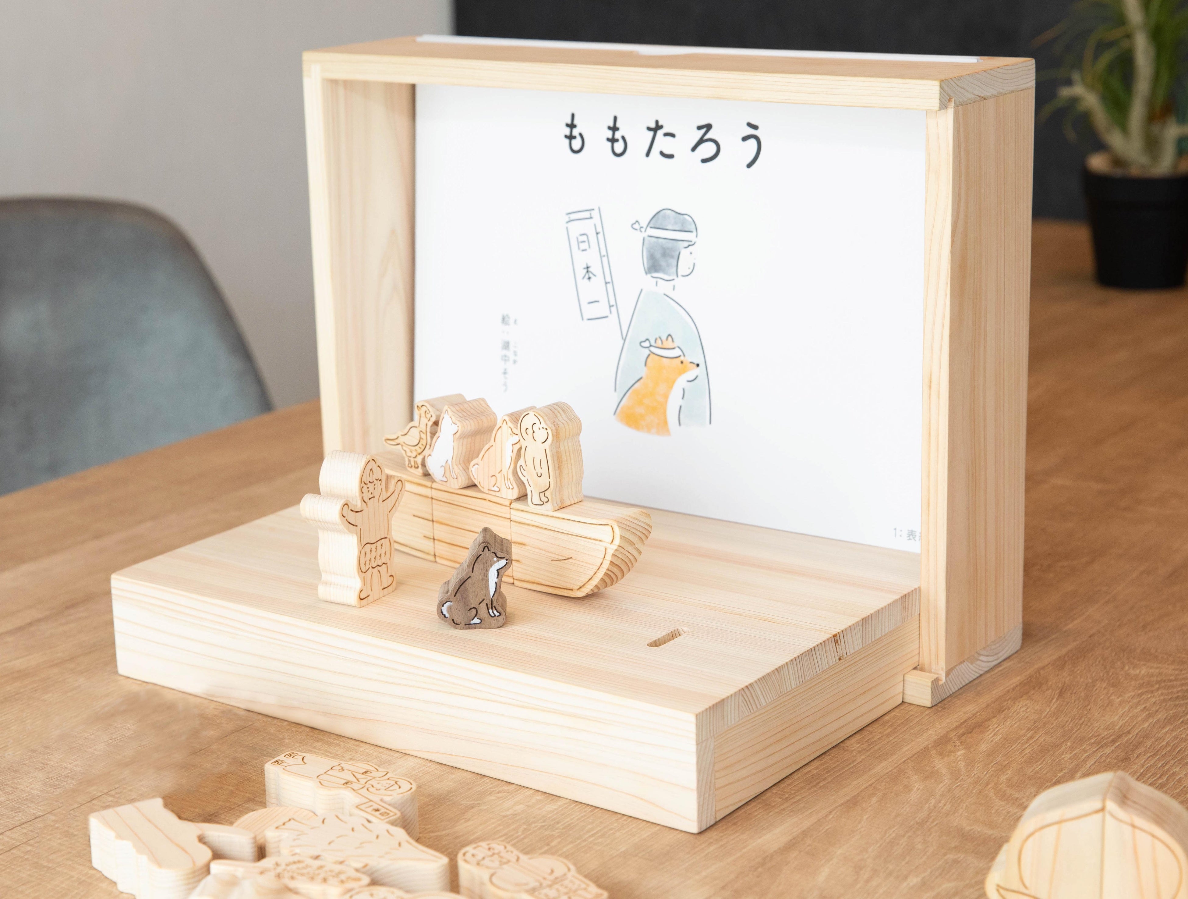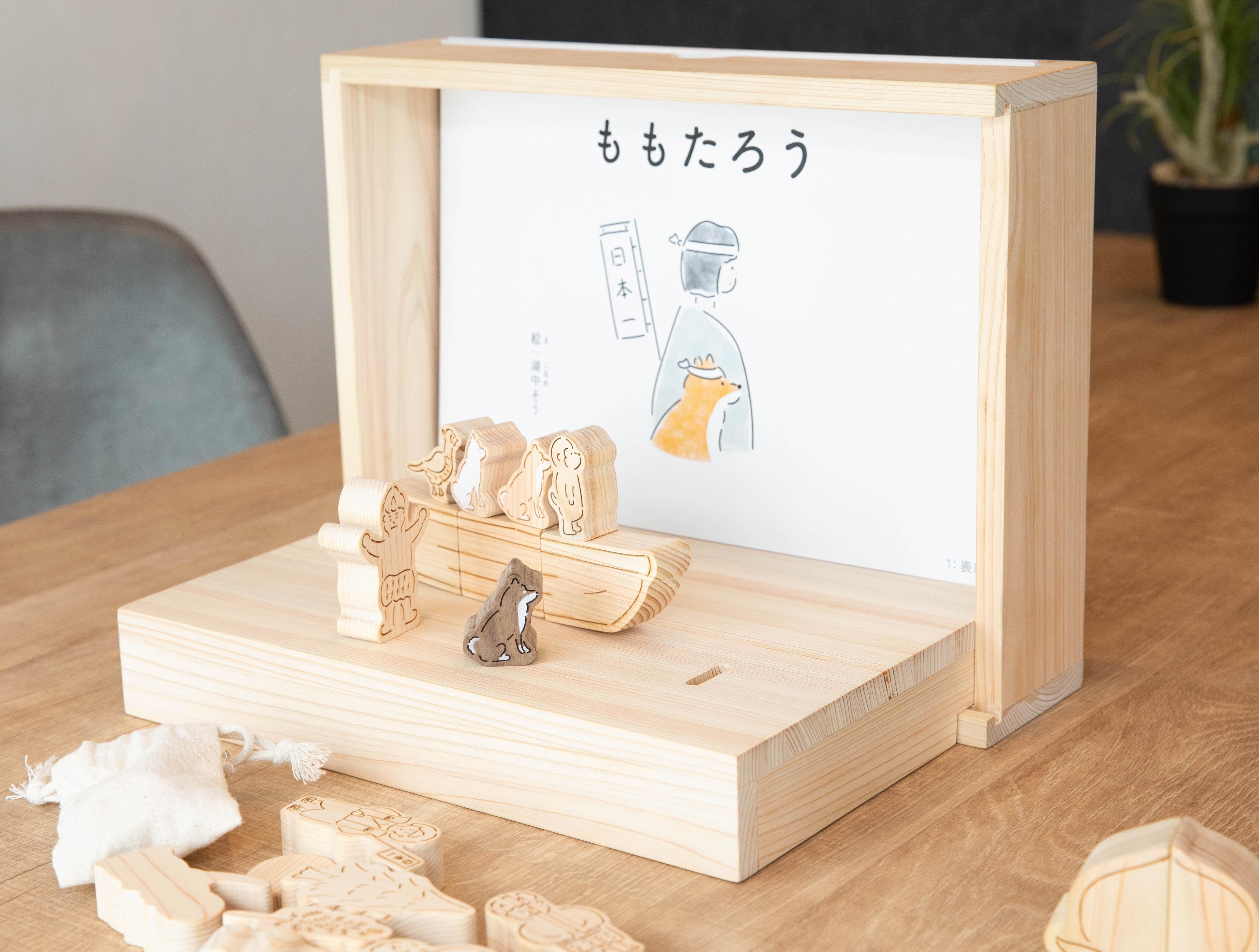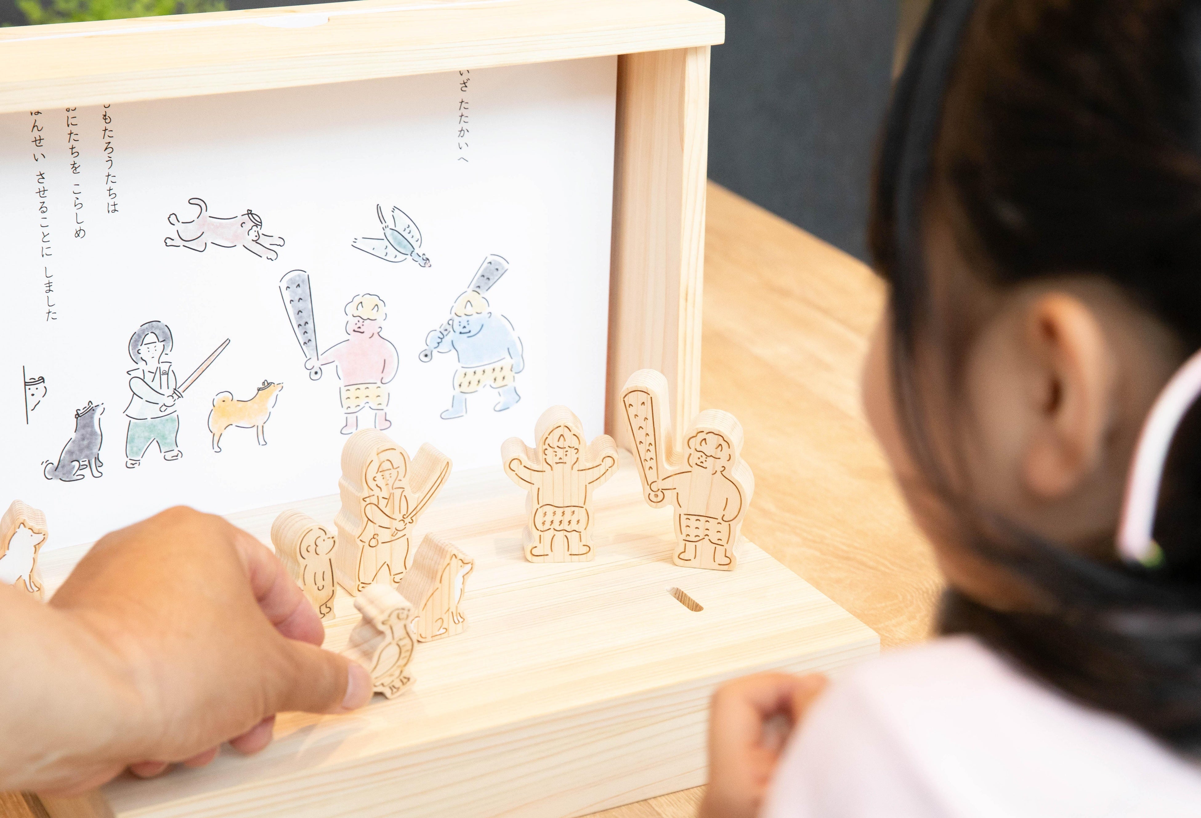 SDGsな視点でリメイクされた、ユニークな「ももたろう」のお話を聞きながら、ヒノキで作られた登場キャラクターと一緒に遊び、物語に参加できる。新しい絵本のカタチは小さな木材やさんの想いから生まれました。