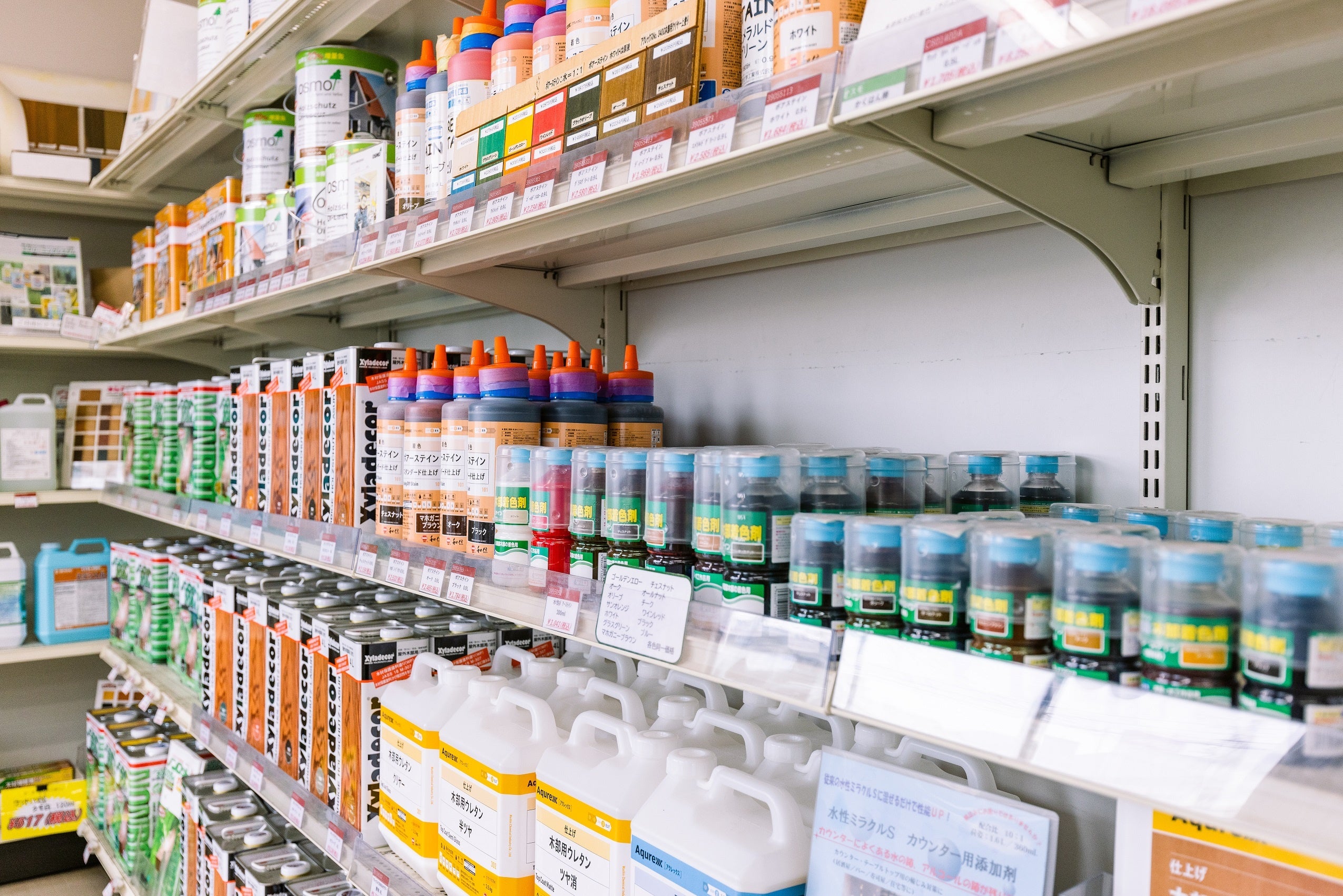 これまでバックヤードにあった塗装用具や資材なども一堂に陳列。刷毛やローラーは圧巻の品揃えで、塗料から用具、資材まで塗装現場で必要な全てがワンストップで手に入る。賑わっていても、広い店内は商品選びや色の比較が容易にできる。昨今、さまざまな塗料や資材がECショップで調達できるが、手に取り、見比べることで、目的にぴったりの品選びが可能になり、選択の失敗やネット購入特有の注文ミスが無くなる。当店に足を運べる地域の方は、まずは実店舗で見定めての購入がおススメです。