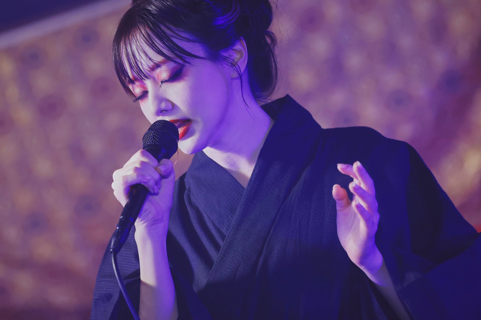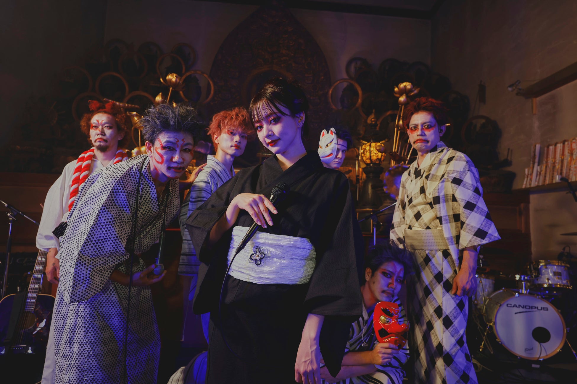 今回は、国内のファンだけではなく海外からの応援してくれている皆さんのために、少し趣向を凝らして日本の文化を感じてもらおうとOCEANSメンバーそして森香澄さんは、伝統文化の一つである歌舞伎から隈取りのメイクを取り入れ、即成院という芸事にゆかりのある地からライブに臨みました。