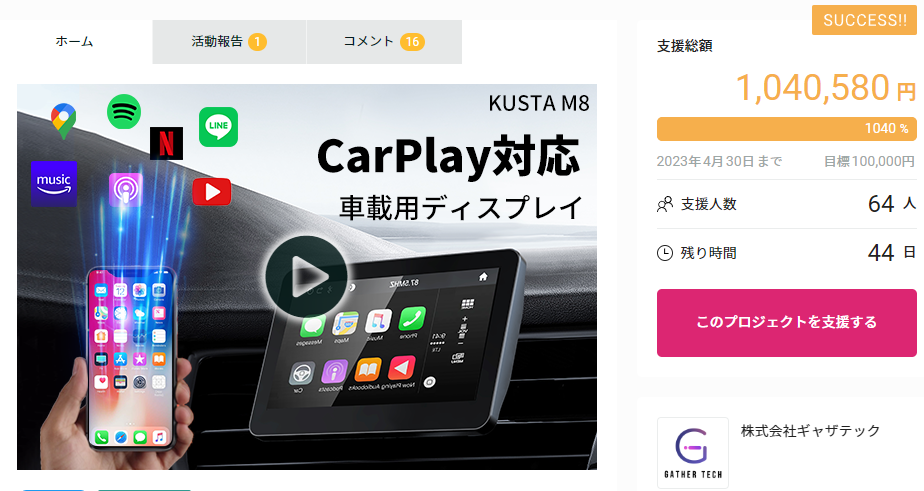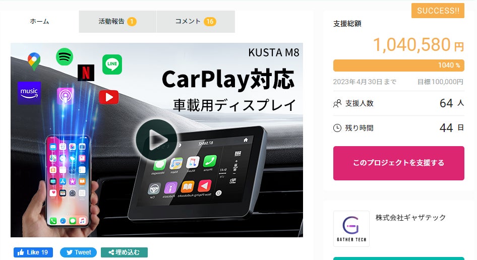 株式会社ギャザテックは、2023年3月17日よりディスプレイオーディオ「KUSTA M8」のクラウドファンディングプロジェクトを、GREEN FUNDINGにて開始いたしました。