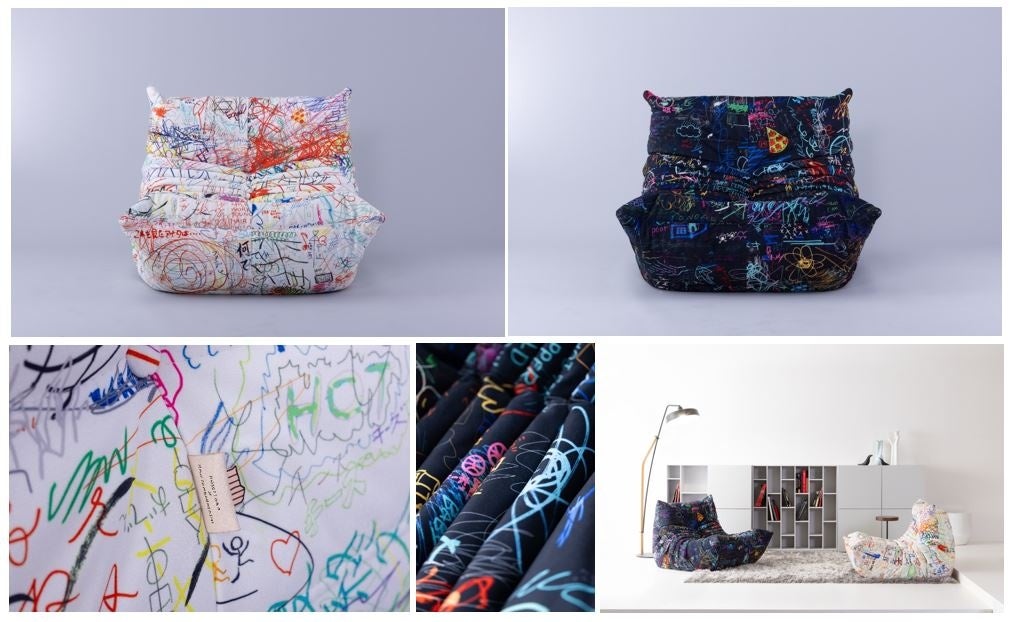 今回コラボデザインを手掛け、文化服装学院の卒業生でもあるとんだ林蘭が、仕事場に置いているロゼトーゴの上でアイデアを考え、作品づくりを行う過程を再現。職人の手仕事から生まれた座り心地と、コラボソファで実現した周年限定生地の肌触りの上で、次の世代で活躍する学生たちのアイデアを考える場づくりをします。