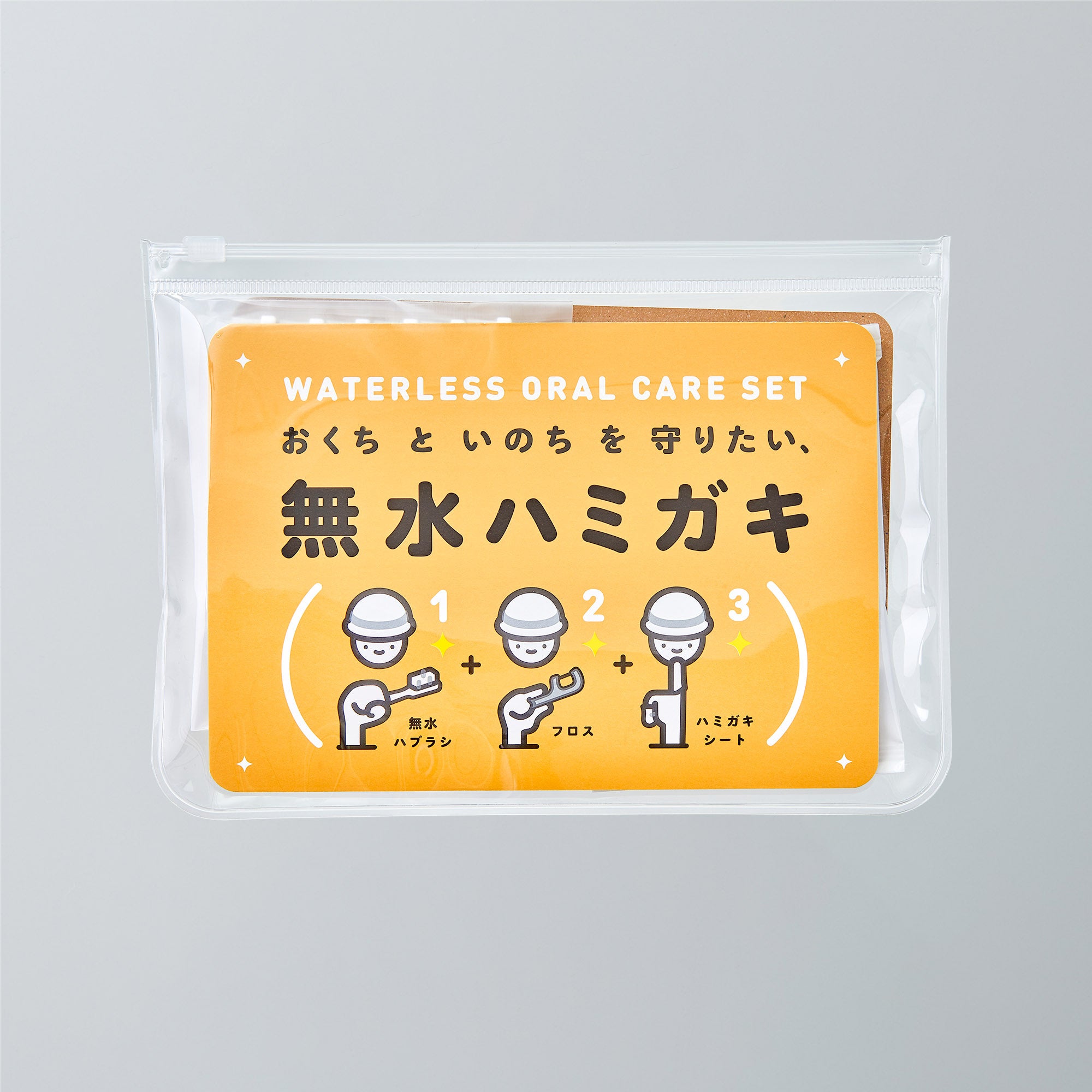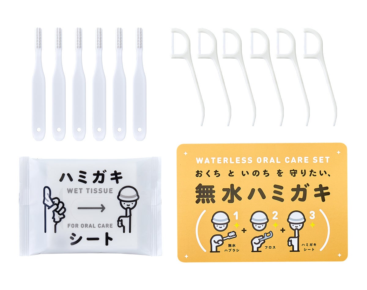 無水ハミガキセットは歯磨きとフロスで汚れを除去し、仕上げに水でゆすぐ代わりにハミガキシートで口腔内を拭うことで、水なしで通常生活での歯磨きと変わらないオーラルケアが完了する3ステップのセットになっています。