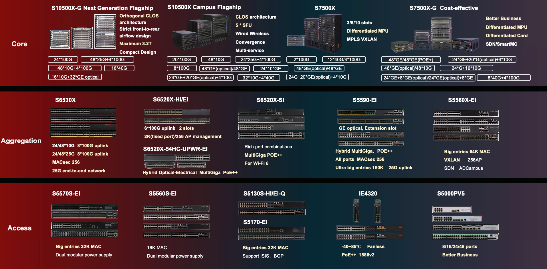 H3Cのスイッチ製品はフルラインアップがリリースされており、コア、アグリゲーション、アクセスのどの分野もカバーされています。