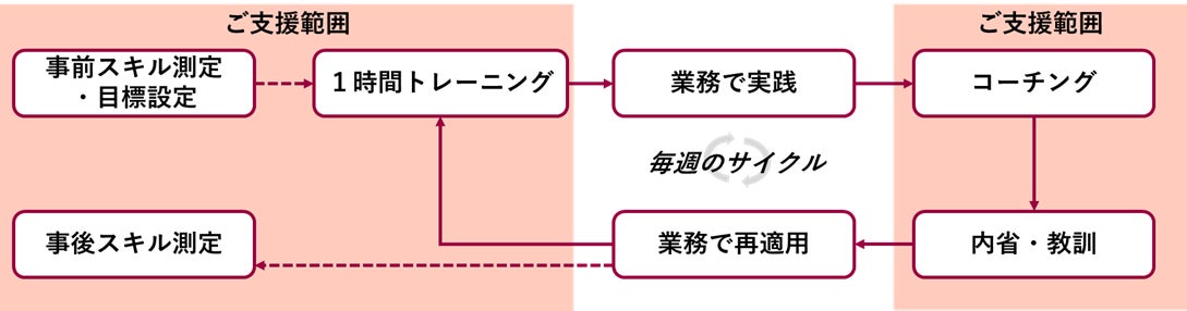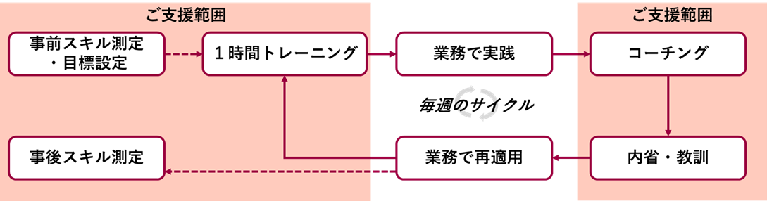 参加者を複数のグループに分け、グループごとに毎週1時間トレーニングを行います。トレーニング以外の時間では、参加者上長への連携と受講生へのメール・電話・Web会議によるコーチングを提供し、実務での活用を促進します。