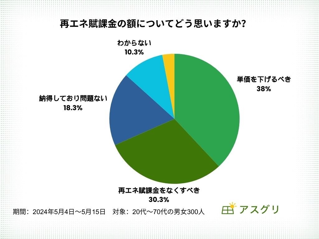 「単価を見直し、下げるべきだ(38.0%)」、「再エネ賦課金自体をなくすべきだ(30.3%)」、「納得しており、このままで問題ない(18.3%)」