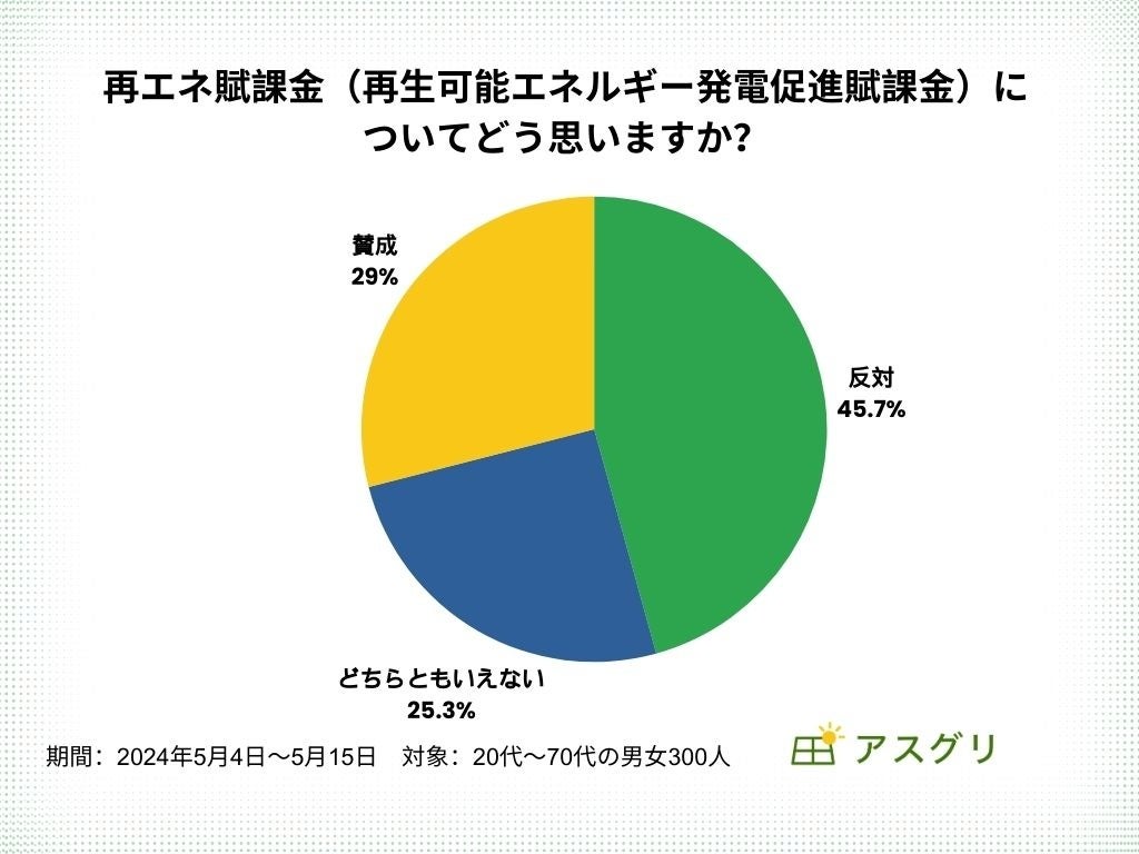 今回の調査では、反対意見が45.7%となり、賛成意見29.0%に比べ、多くの方が再エネ賦課金に関してはネガティブな姿勢を持っていることがわかりました。