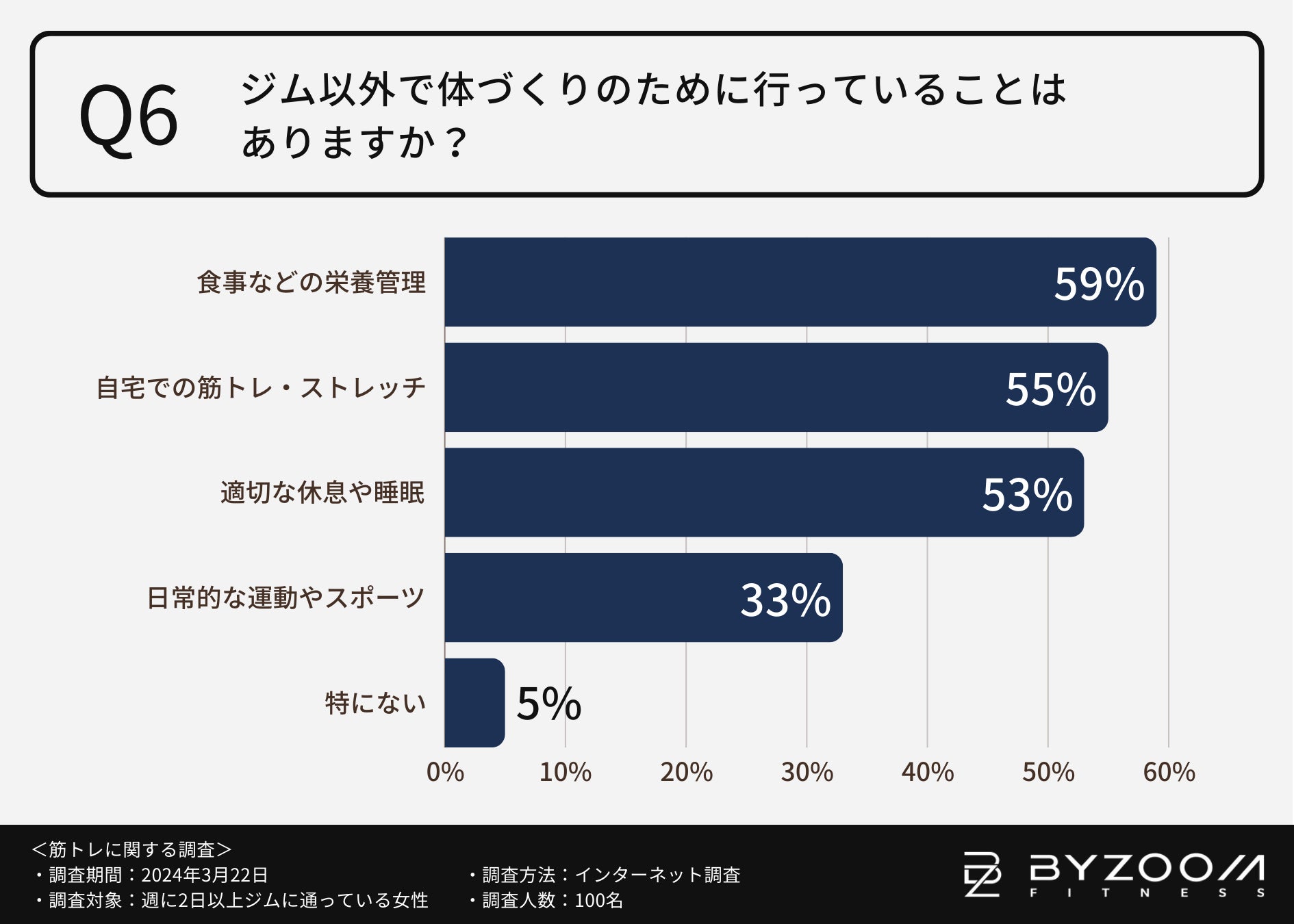 ここまで、ジムでの筋トレ事情について伺ってきましたが、次に、ジム以外で体づくりのために行っていることはあるか伺ったところ、「食事などの栄養管理(59.0%)」「自宅での筋トレ・ストレッチ(55.0%)」「適切な休息や睡眠(53.0%)」という回答が集まりました。