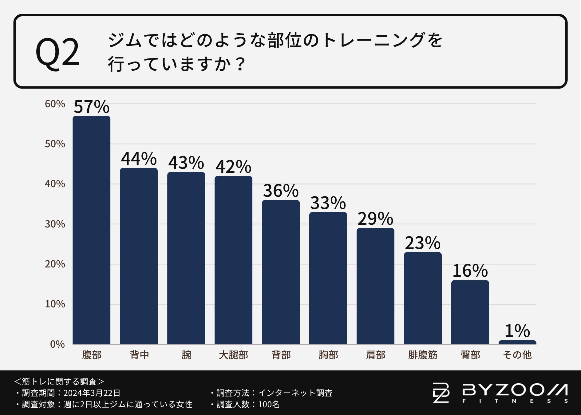 ジムではどのような部位のトレーニングを行っているか伺ったところ、「腹部(57.0%)」「背中(44.0%)」「腕(43.0%)」という結果となりました。