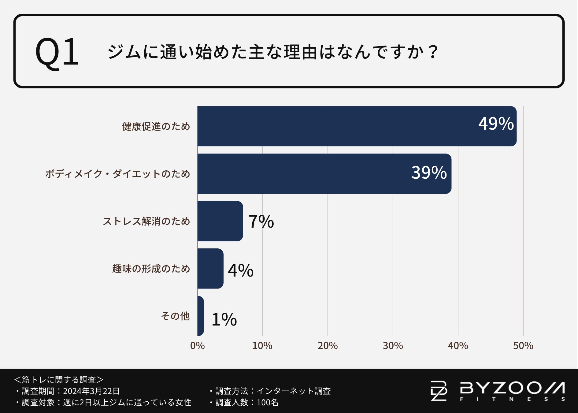 はじめに、ジムに通い始めた主な理由について伺ったところ、「健康促進のため(49.0%)」「ボディメイク・ダイエットのため(39.0%)」という回答が大半の結果でした。