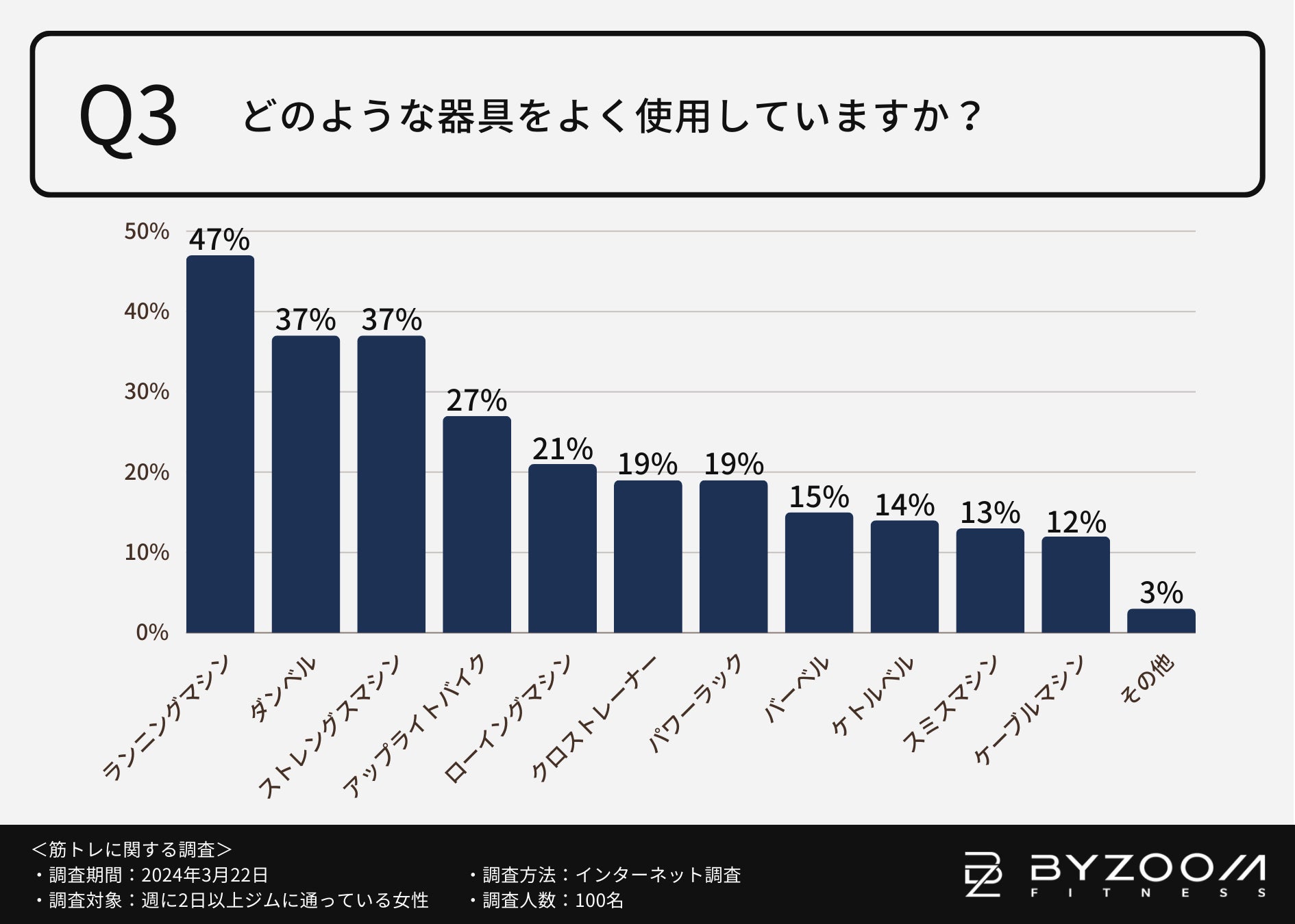 次に、どのような器具をよく使用しているか伺ったところ、「ランニングマシン(47.0%)」「ストレングスマシン(37.0%)」「ダンベル(37.0%)」という回答が集まりました。