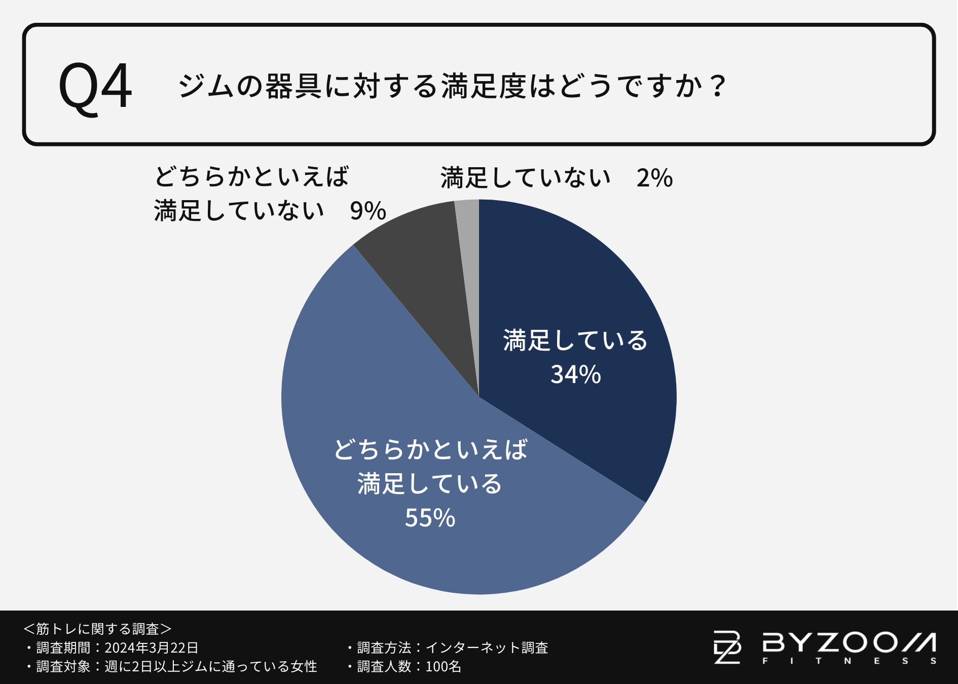 結果として、約9割の方はジムで使用する筋トレ器具に満足していると回答しており、器具選びは重要なポイントになるようです。