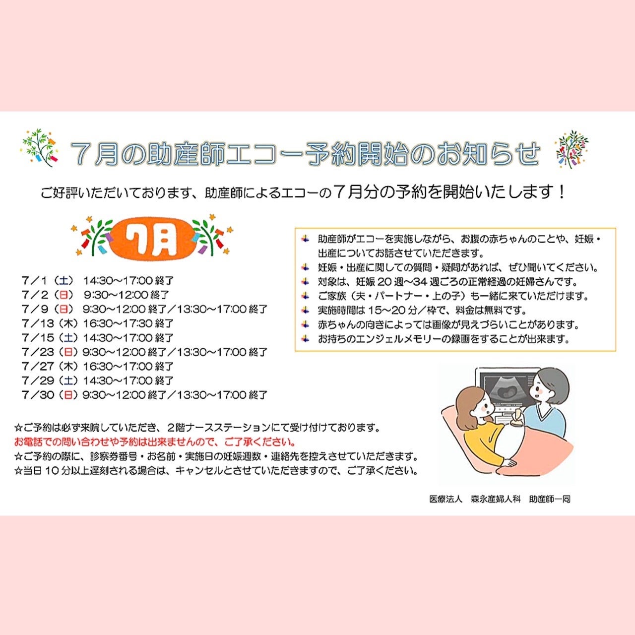 【助産師エコー】7月日程予約開始のお知らせ|森永マタニティクリニック