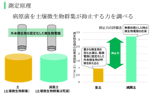 土壌診断用バイオセンサーの測定原理を紹介します。土壌微生物群集(土壌フローラ)の中に病原菌を侵入させると敵が来たことを認識し、これを排除しようとします。電極に病原菌を付けて土壌へ挿入し、排除する力(抑止する力)を計測する事で、病害発生のリスク診断を行います。土壌中の個々の微生物の種類等は調べず、複雑系全体としてどれくらい病原菌を排除する力があるかをみます。様々な病原菌や善玉菌を電極に付けて調べてみると、面白いことにどれも同じ反応をします。これは、人間の免疫力と同じで、外から侵入して来たものが善か悪かは判断せず、単に異物としてこれを排除する力だからです。