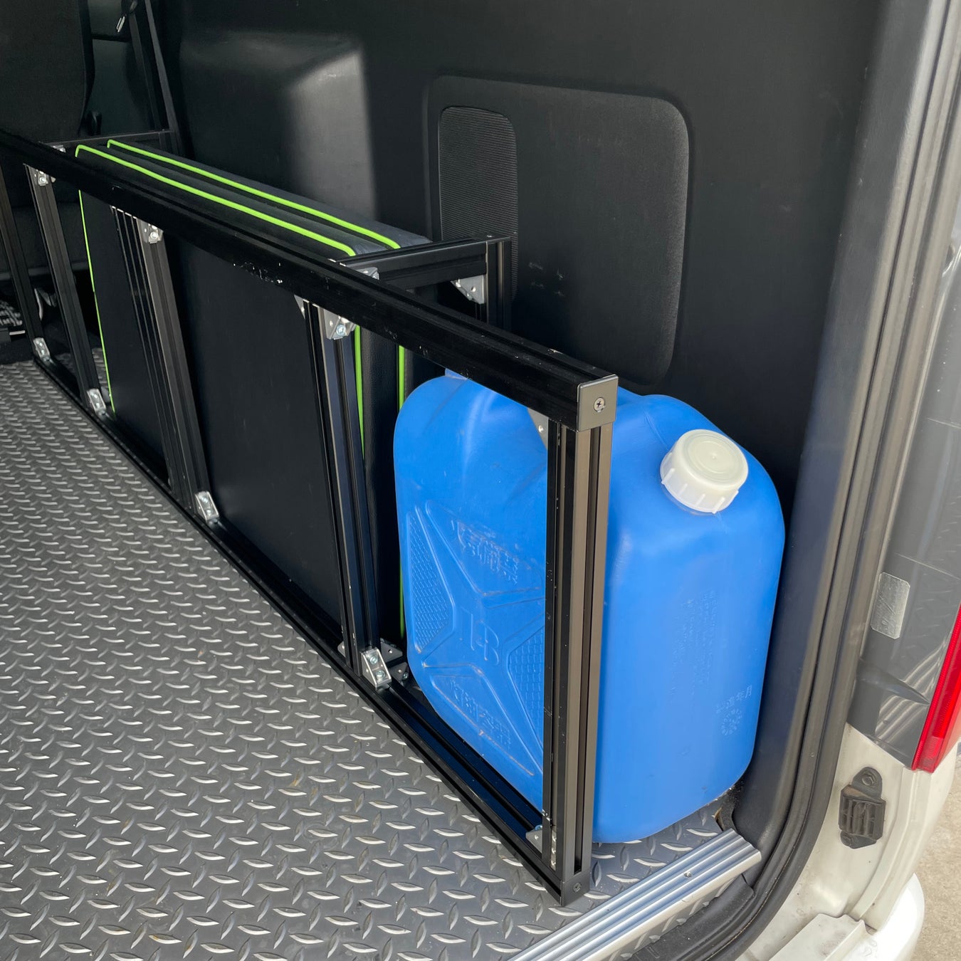 ベースフレームを極力シンプルにすることでマットの収納はもちろんのこと、ベースフレーム前後に18ℓ灯油缶が入るスペースを確保。 キャンプ用品や工具箱、ポータブル電源の収納スペースとしても活用できます。